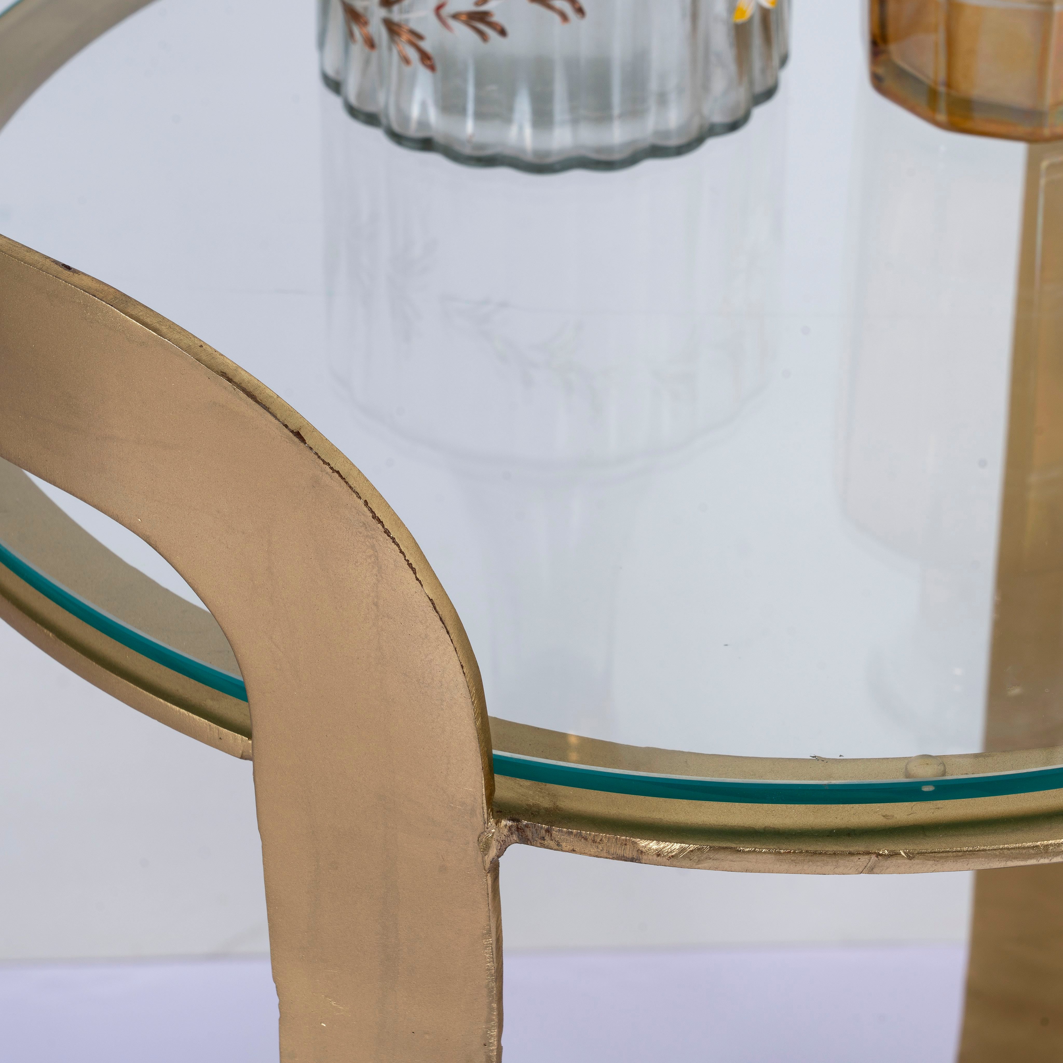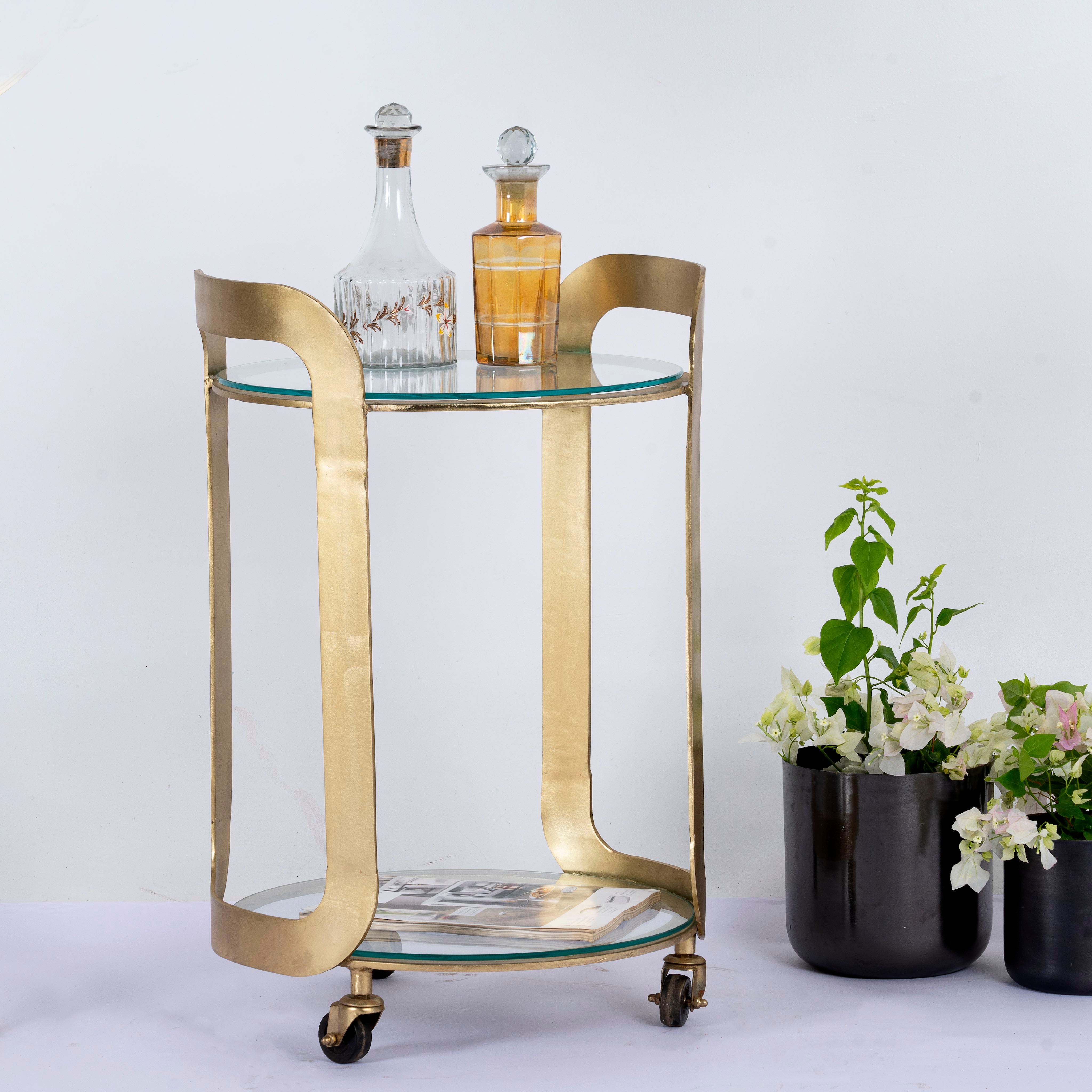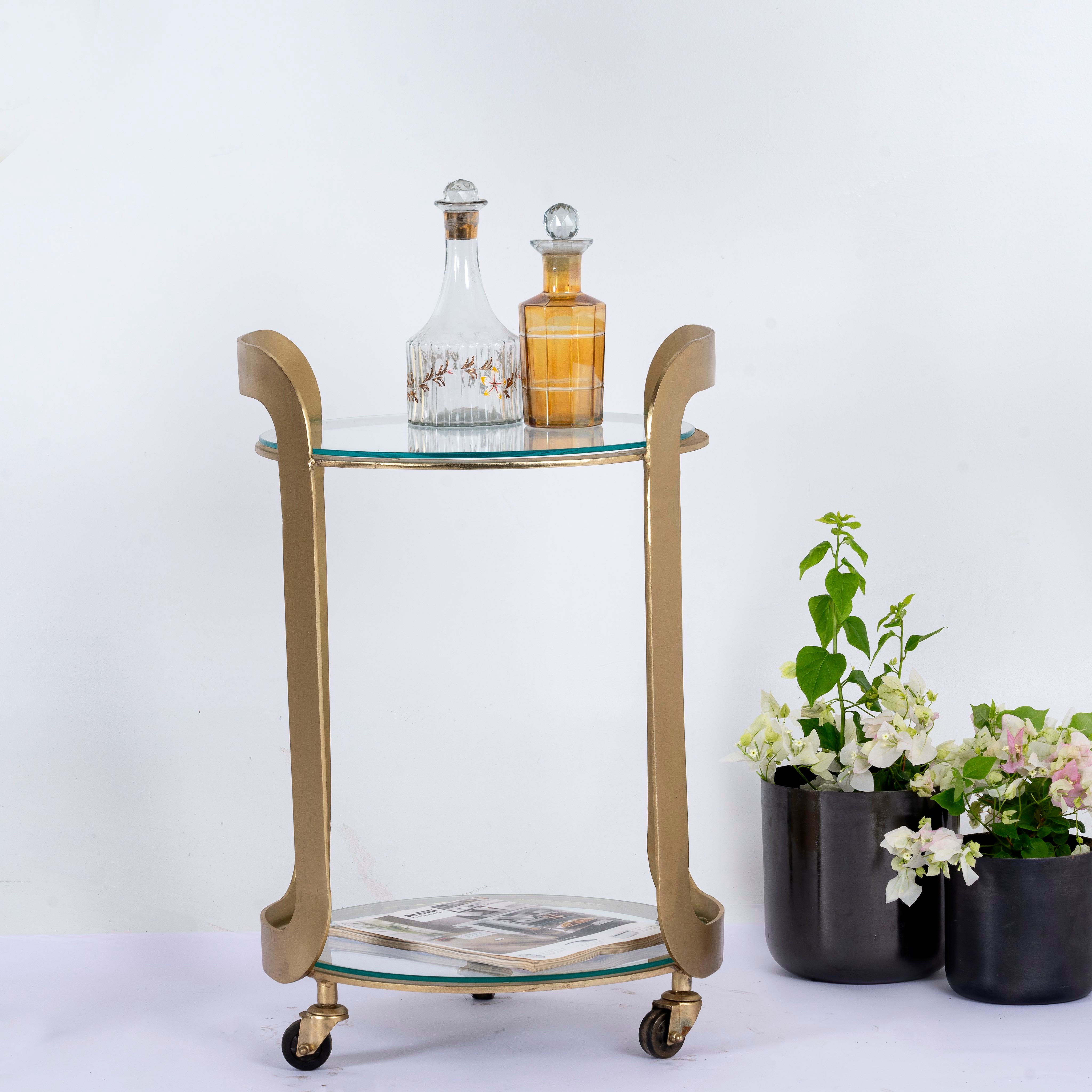 Ontdek de unieke serveerwagen Sheyla met een frame van messing gecoat ijzer en glazen oppervlakken. Deze elegante barwagen combineert functionaliteit en esthetiek perfect om uw ruimte te verrijken.