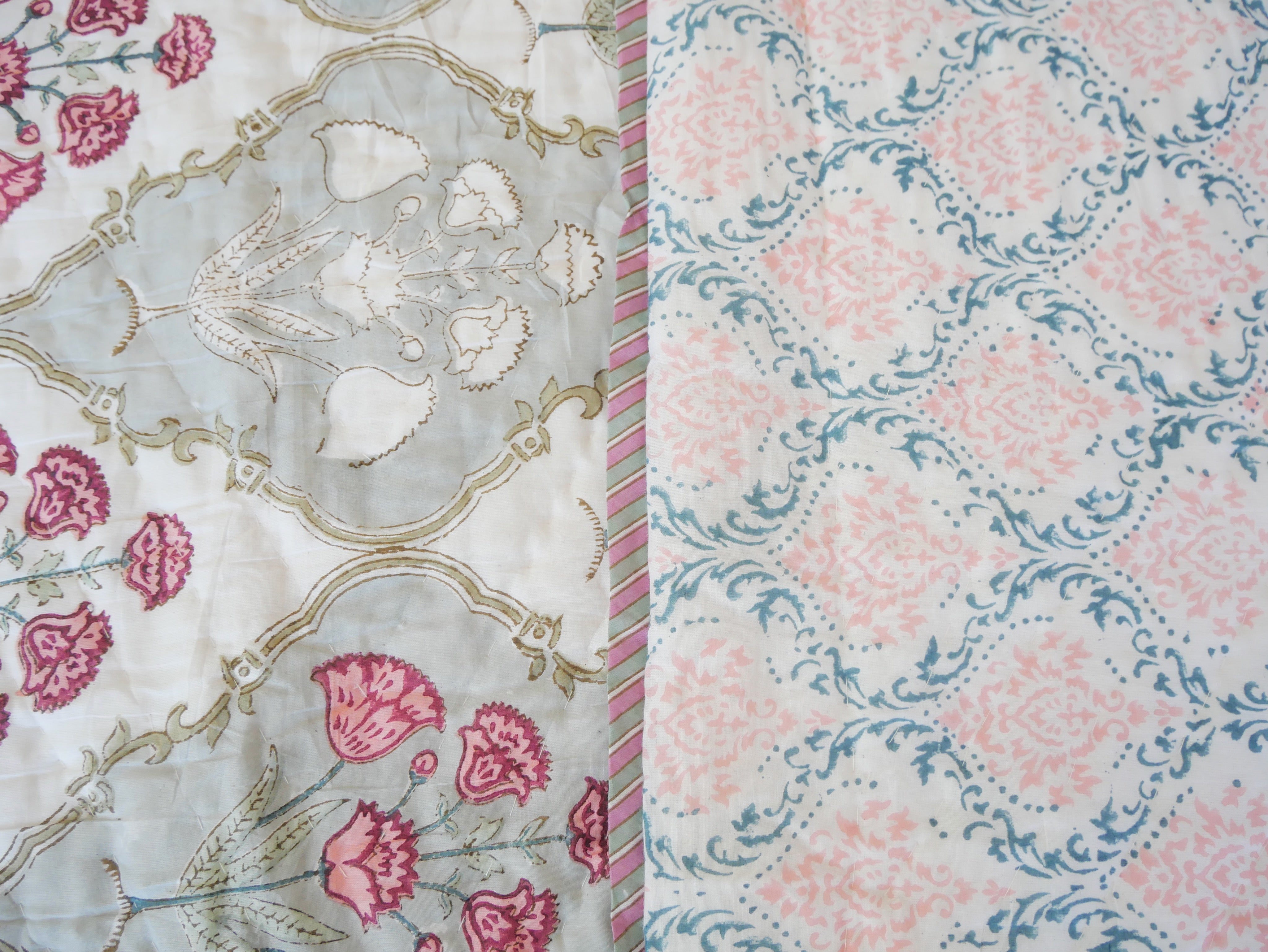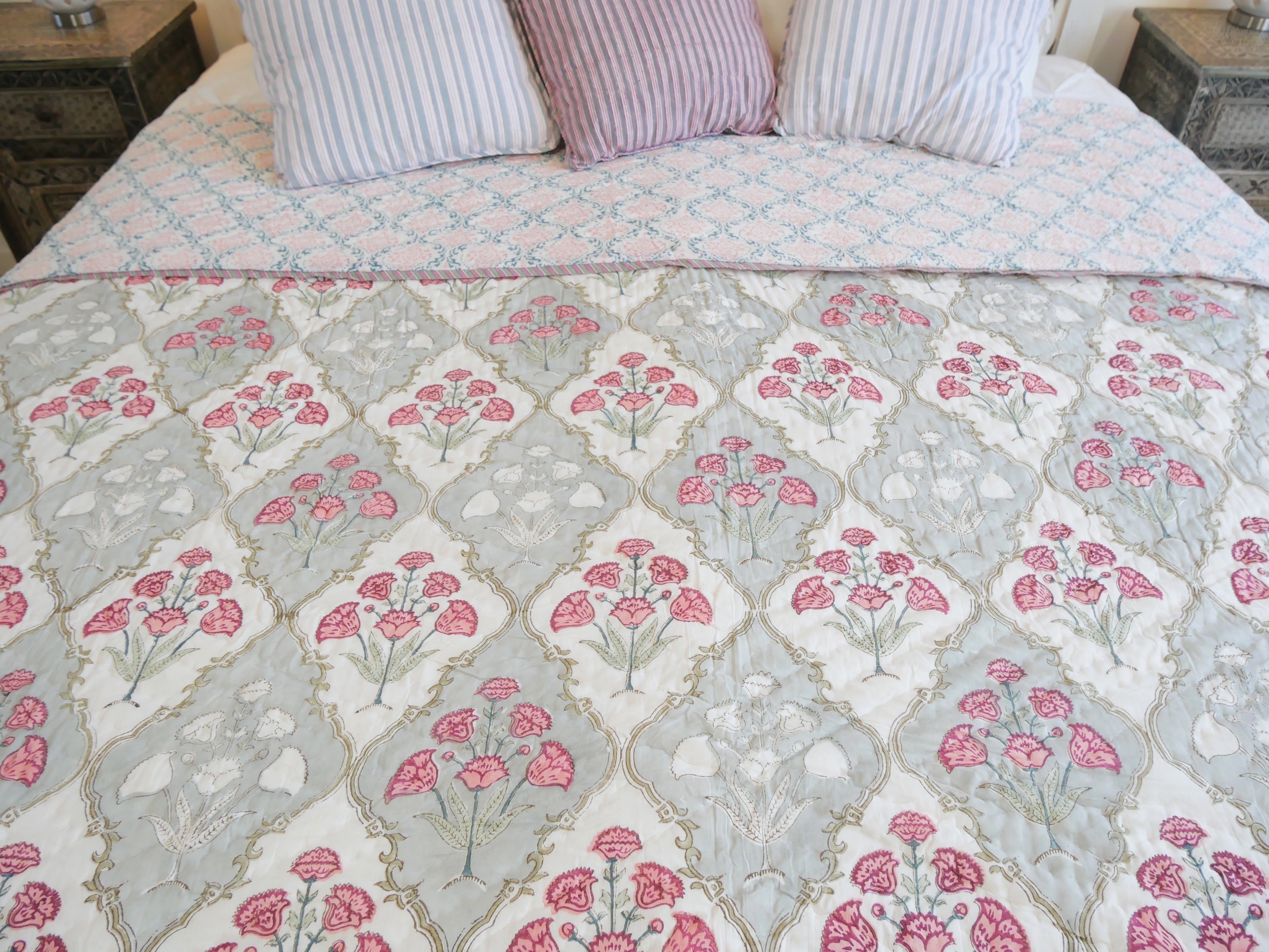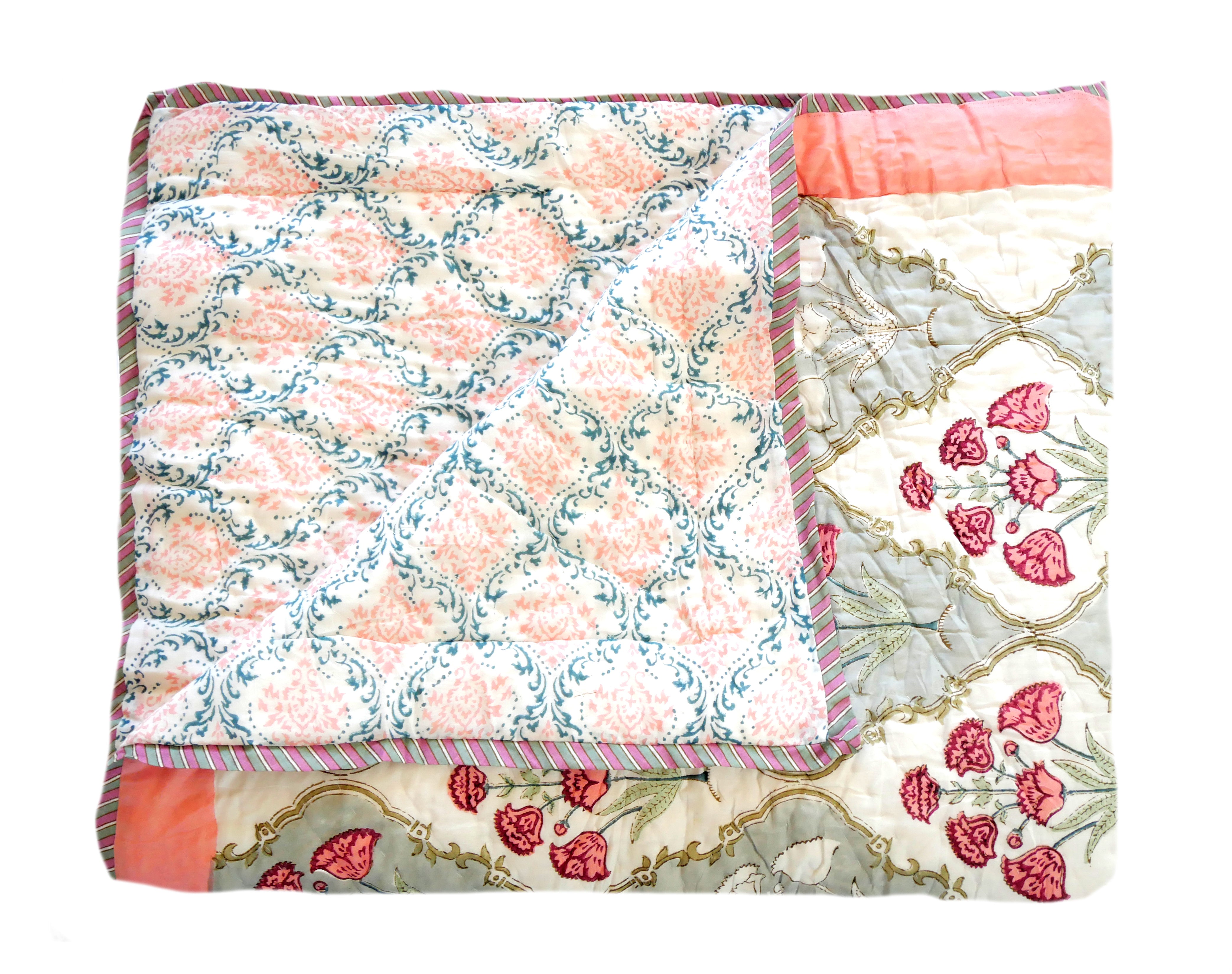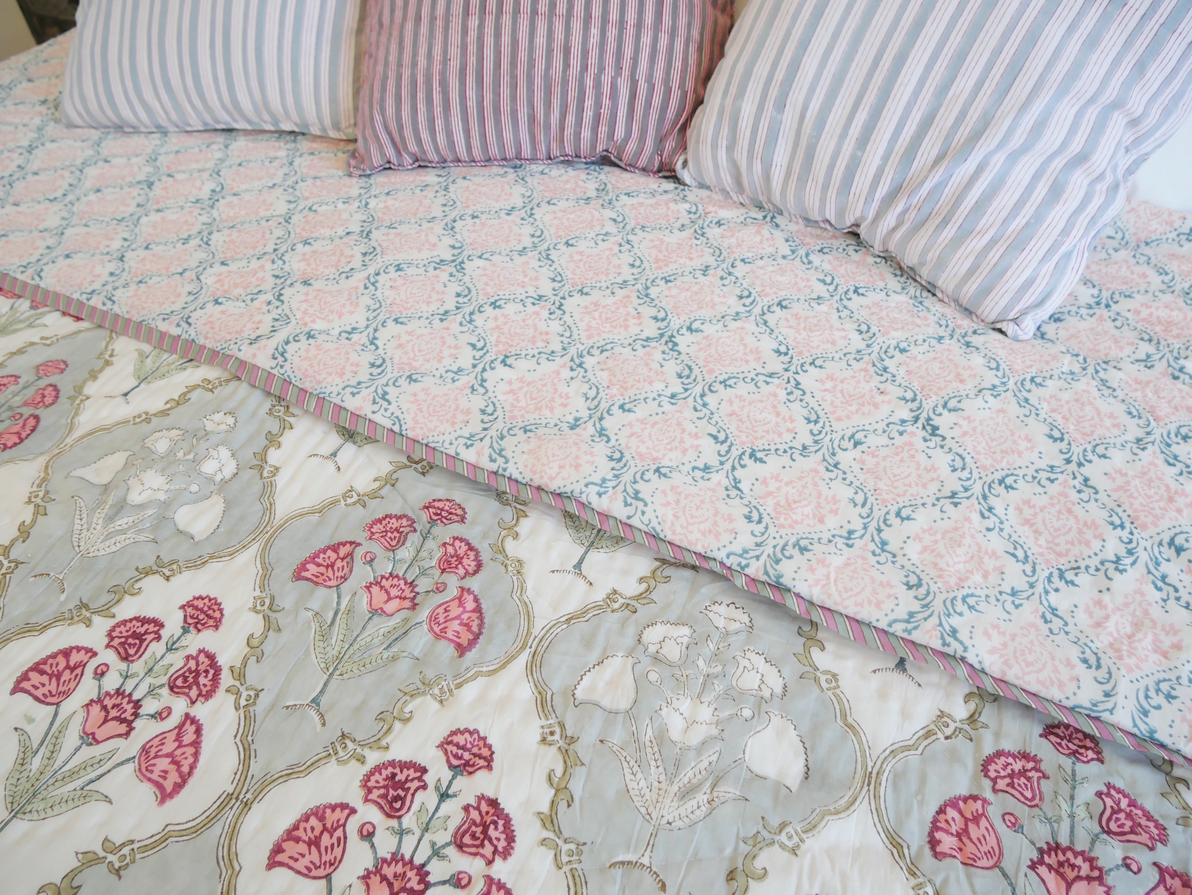 De quilt is aan beide zijden uitvoerig met de hand bedrukt in verschillende patronen in typische ontwerpen uit Rajasthan en kan daarom worden gedraaid, zoals te zien op onze foto's.