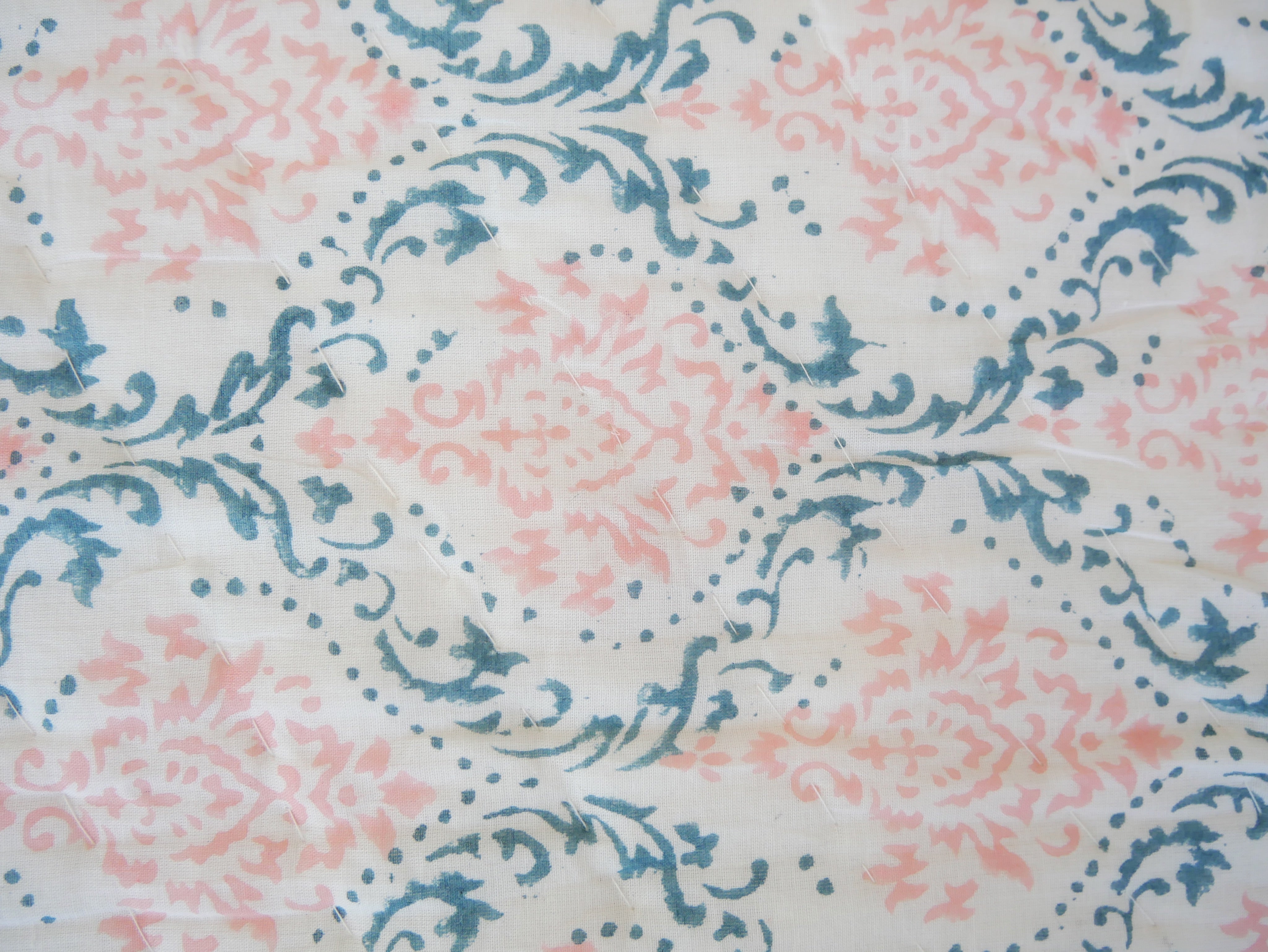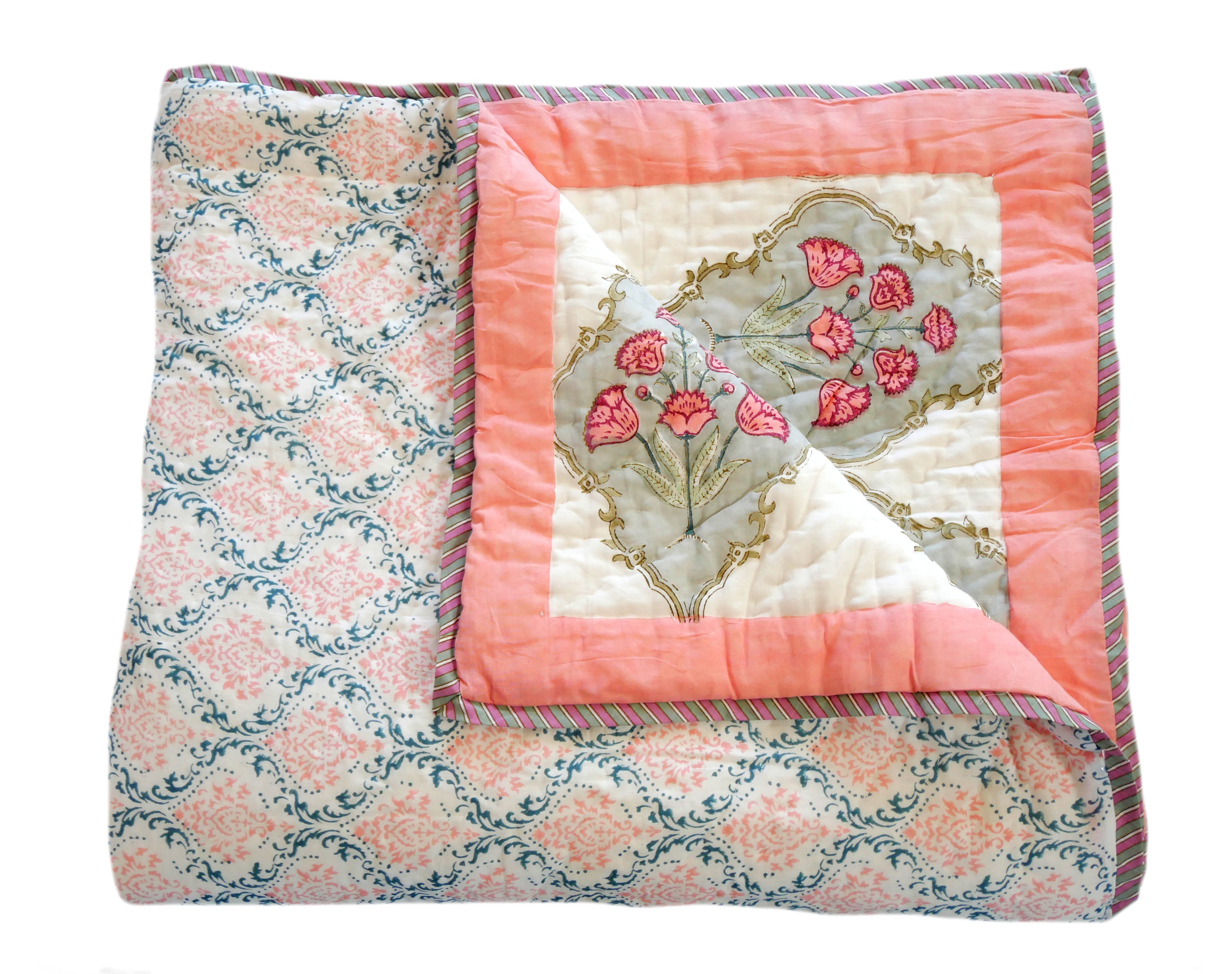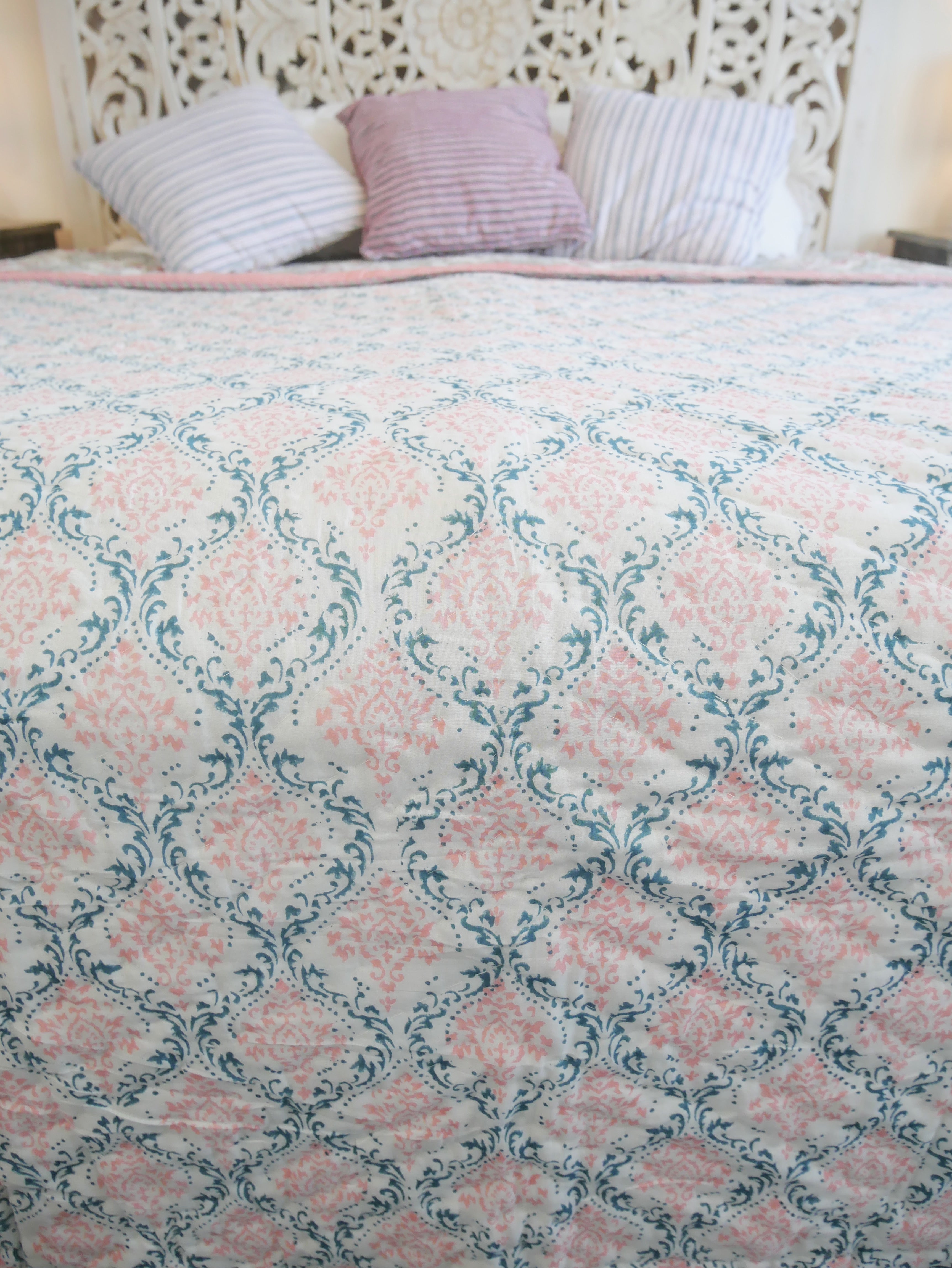 De quilt is aan beide zijden uitvoerig met de hand bedrukt in verschillende patronen in typische ontwerpen uit Rajasthan en kan daarom worden gedraaid, zoals te zien op onze foto's.