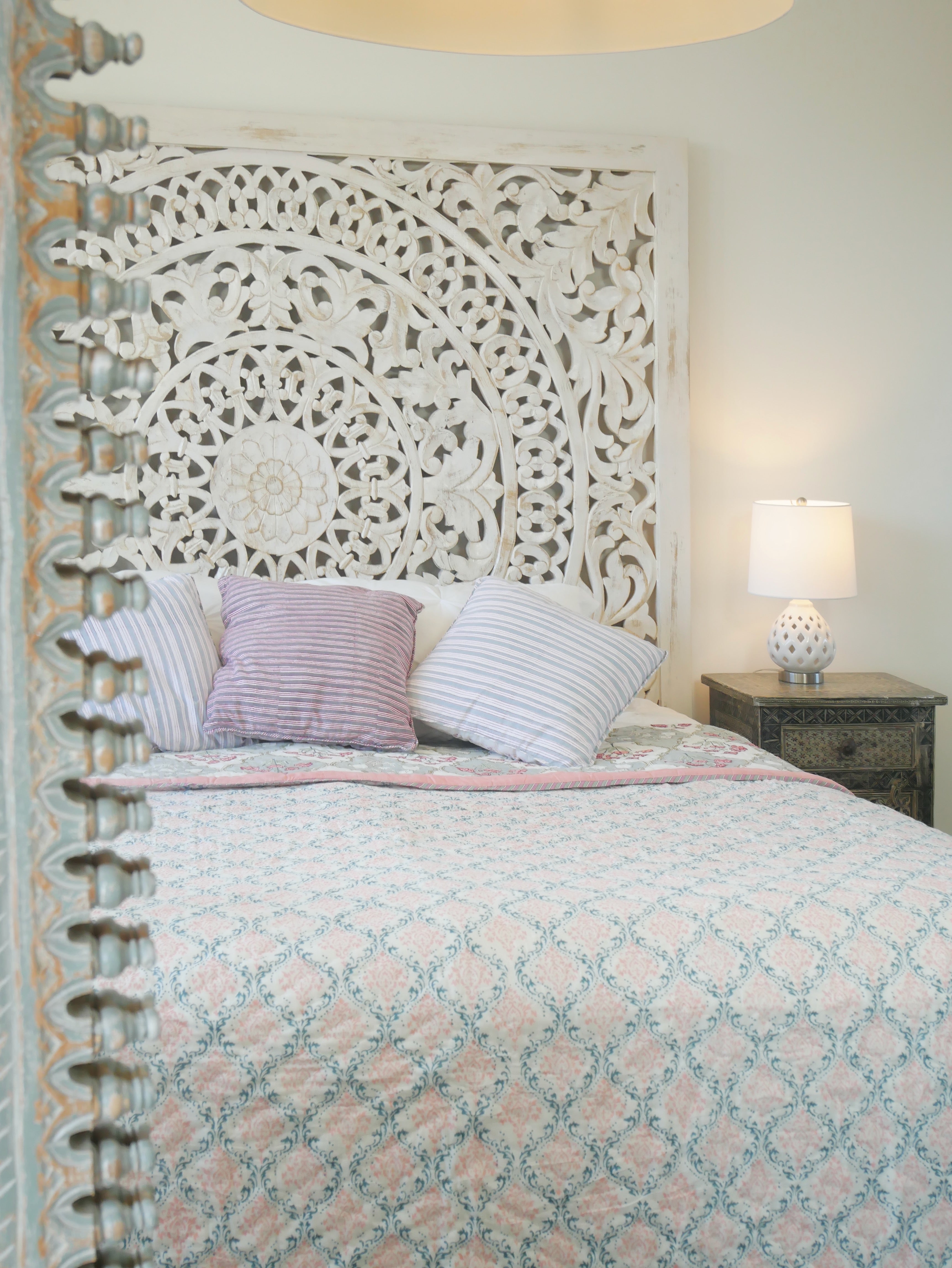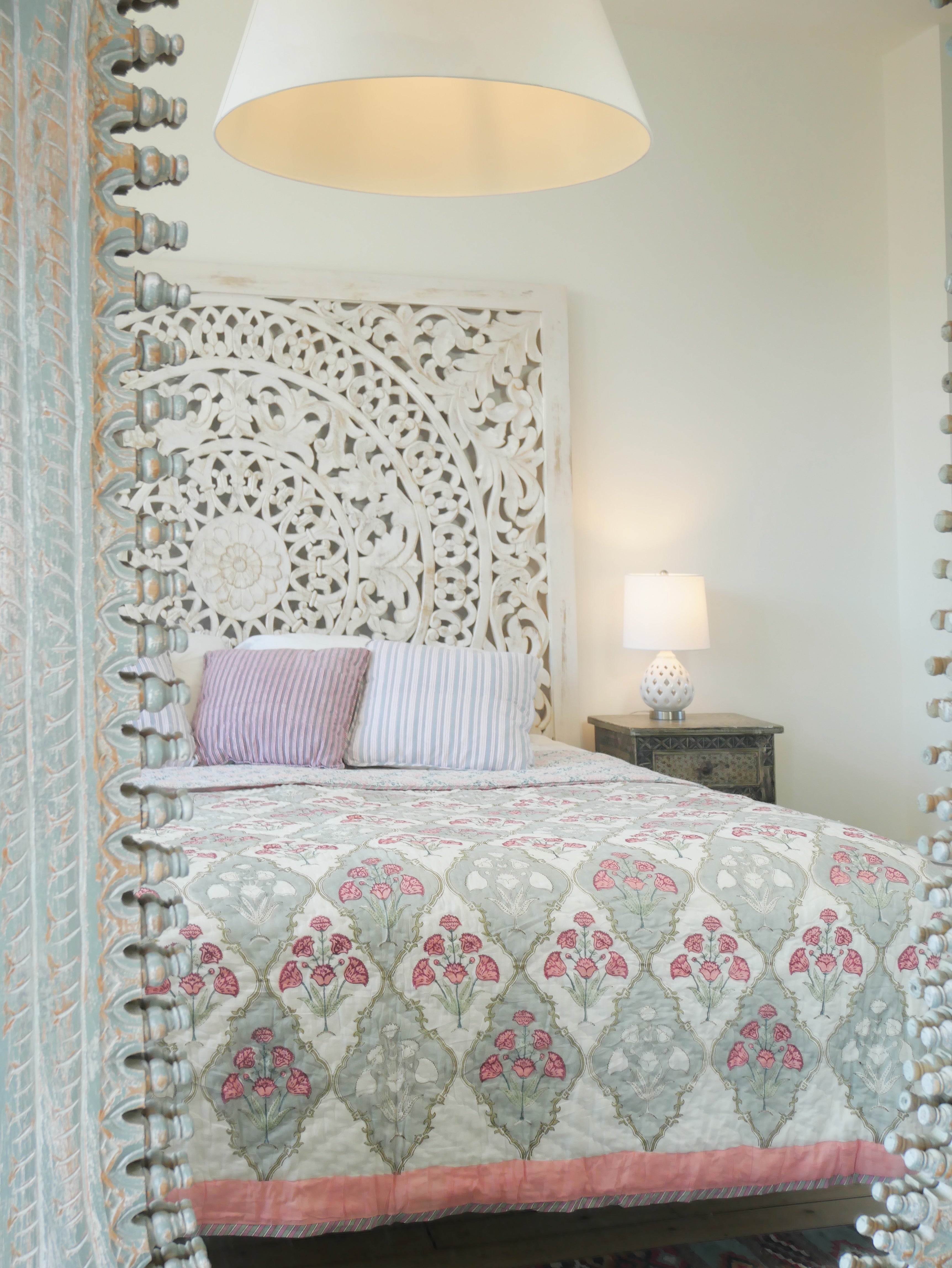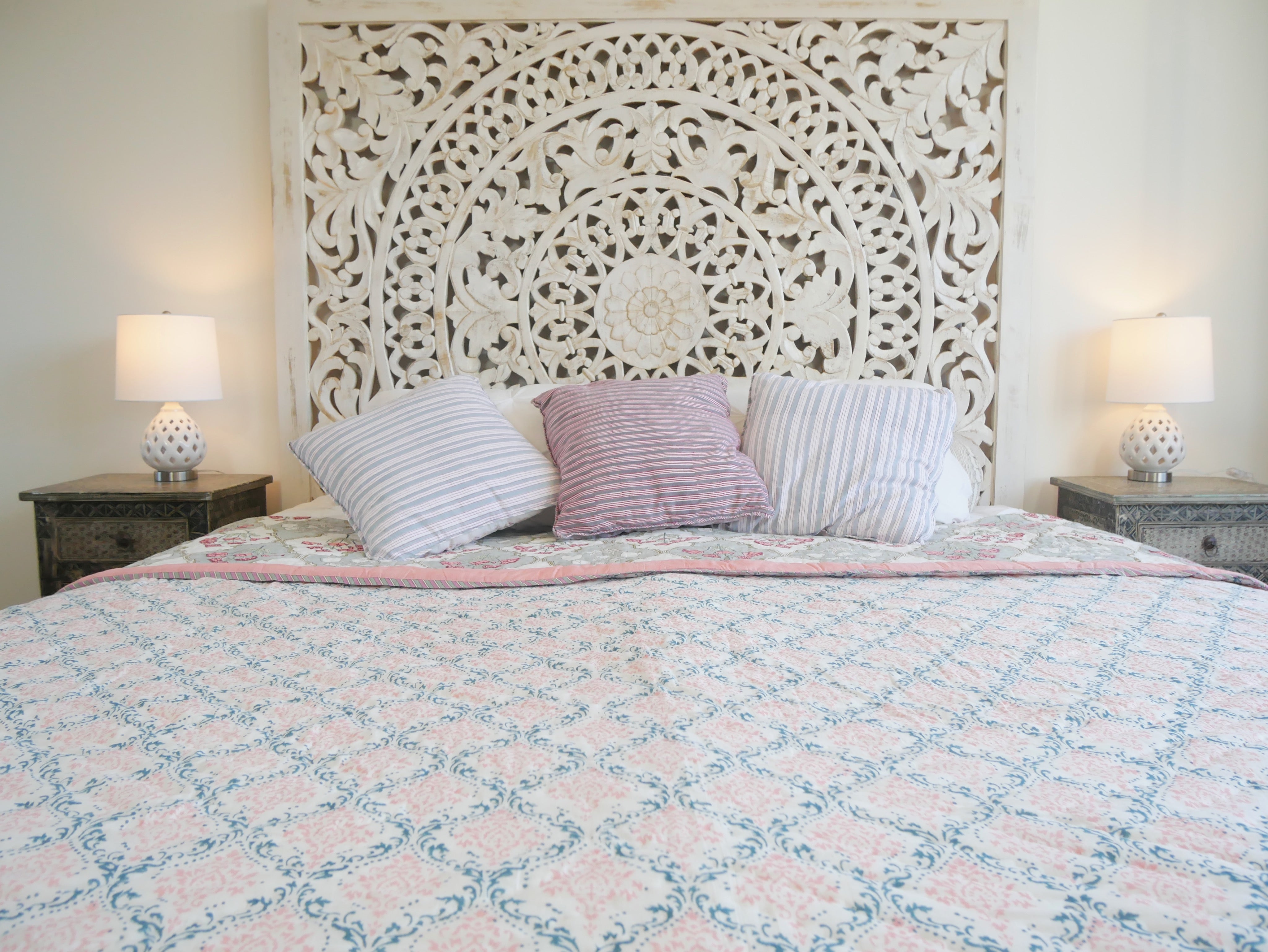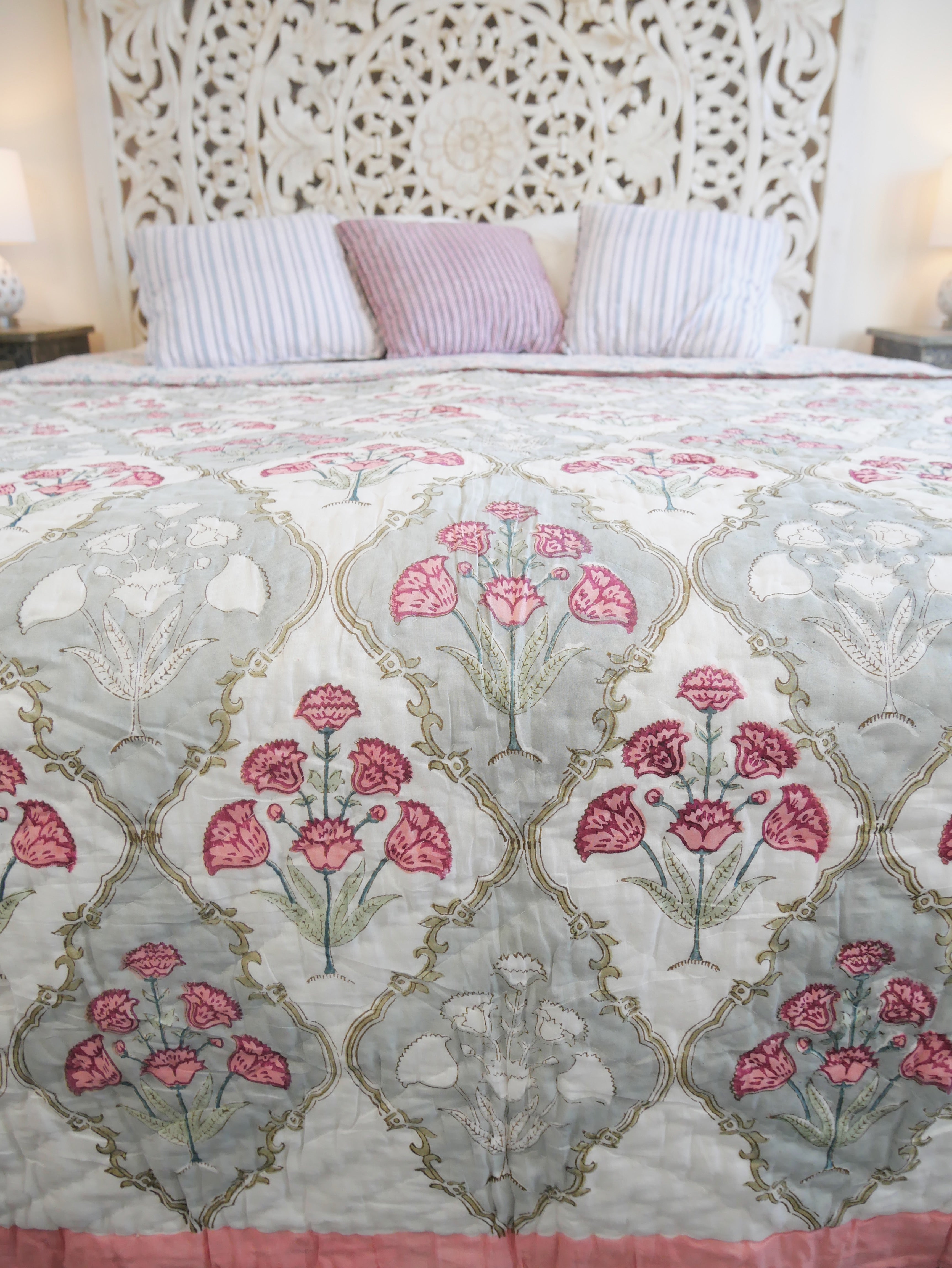 De quilt is aan beide zijden uitvoerig met de hand bedrukt in verschillende patronen in typische ontwerpen uit Rajasthan en kan daarom worden gedraaid, zoals te zien op onze foto's.