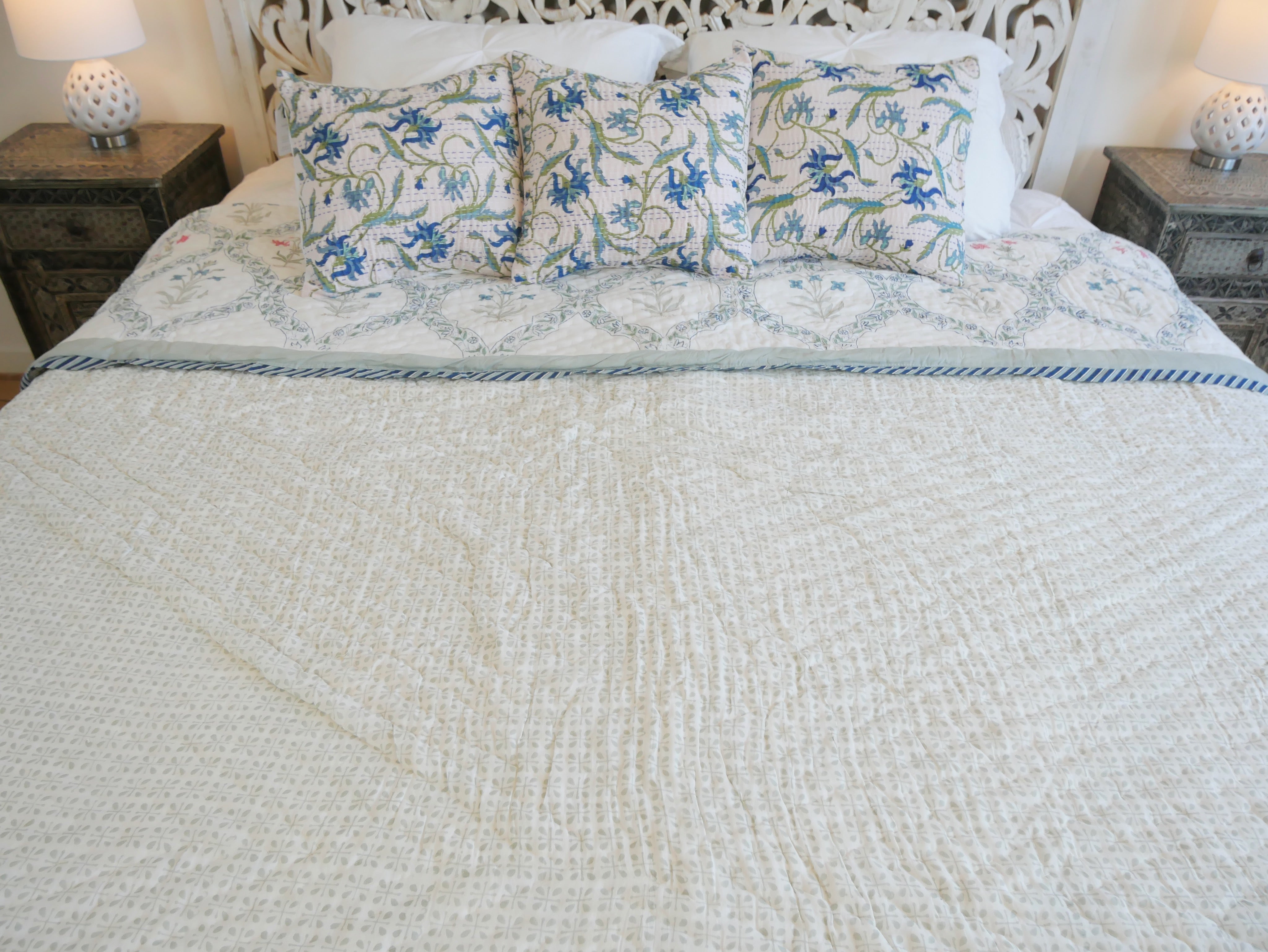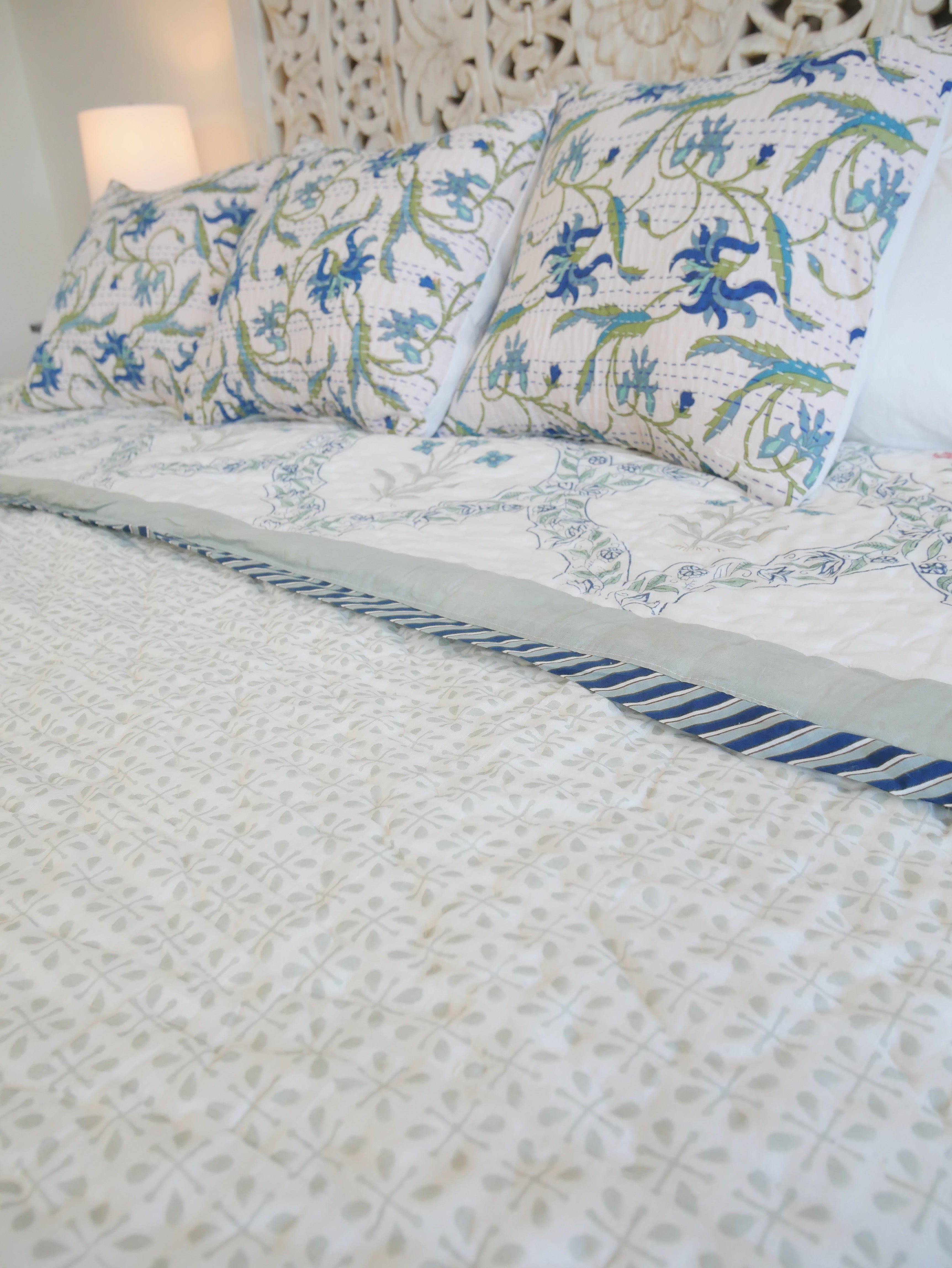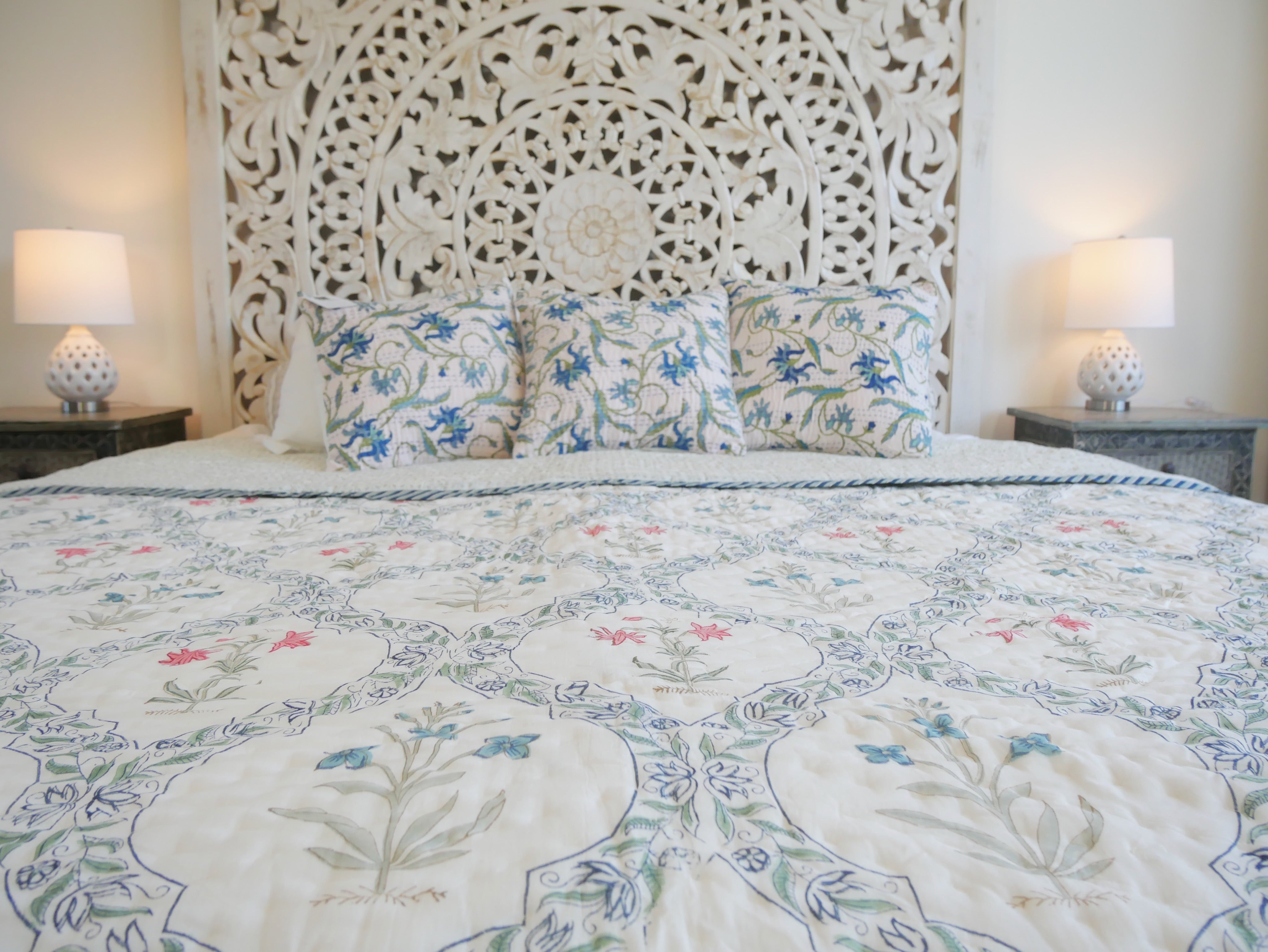 De quilt is aan beide kanten uitvoerig met de hand bedrukt in verschillende patronen die kenmerkend zijn voor Rajasthan en kan daarom worden gedraaid, zoals u op onze foto's kunt zien.