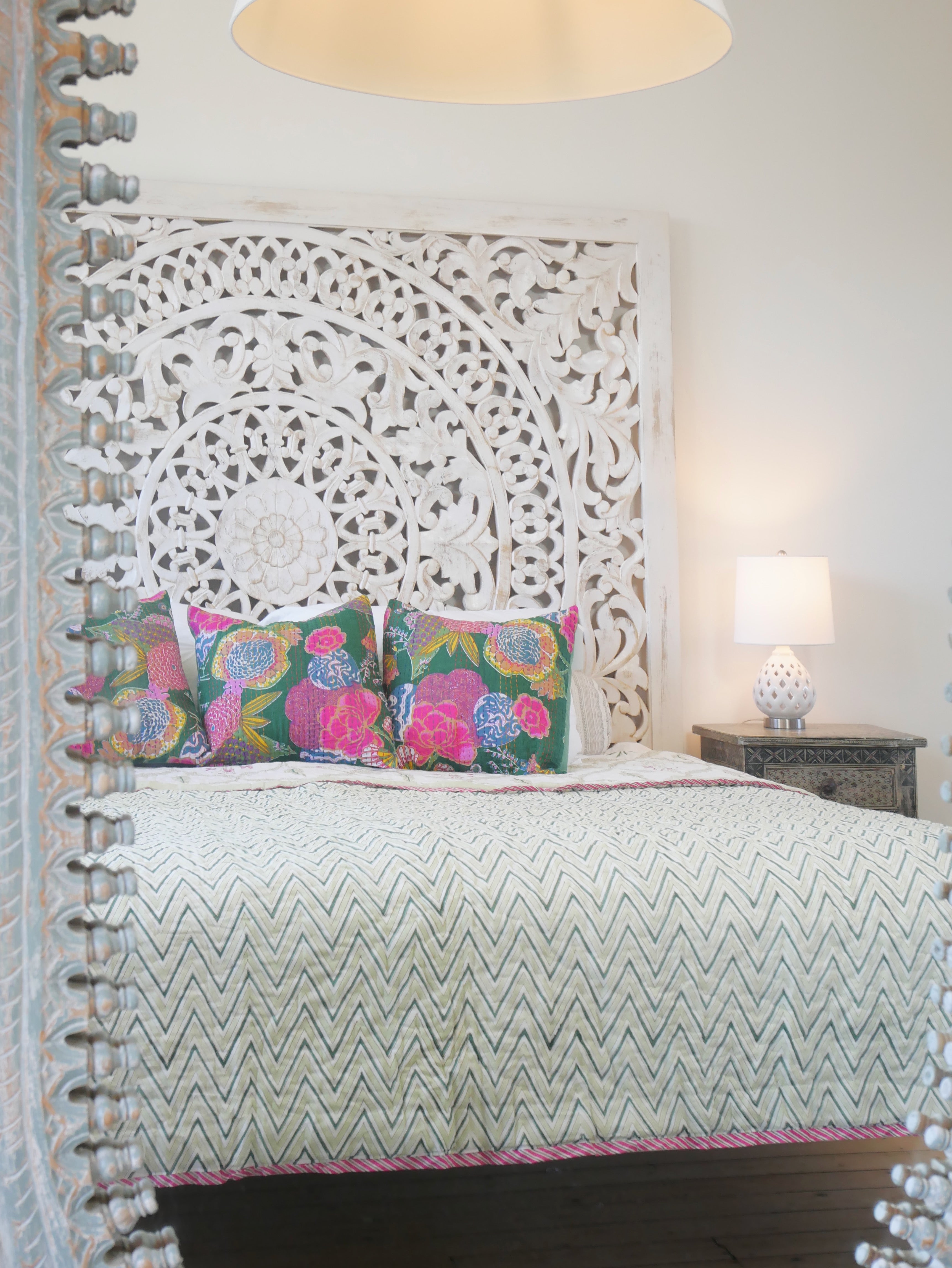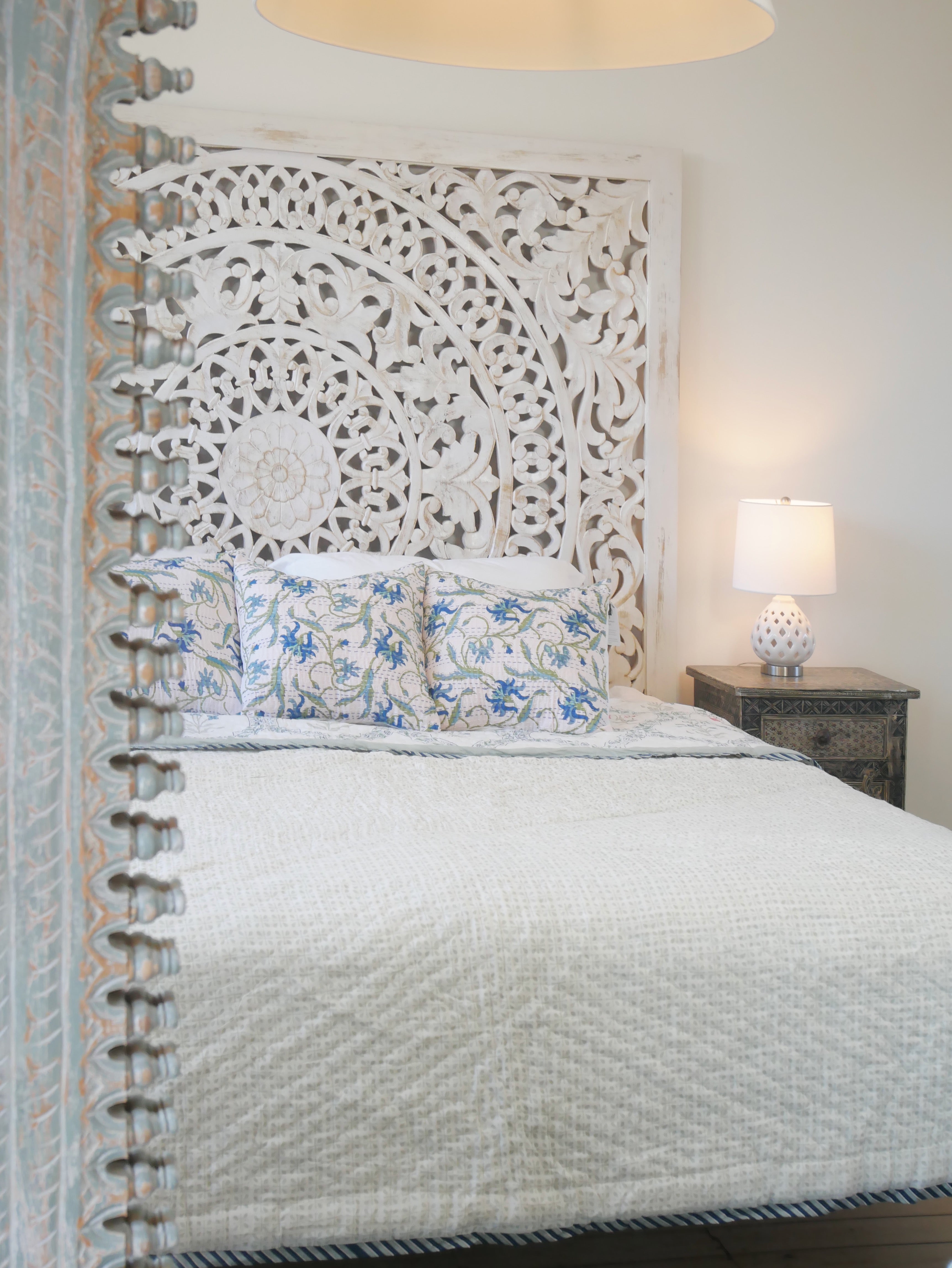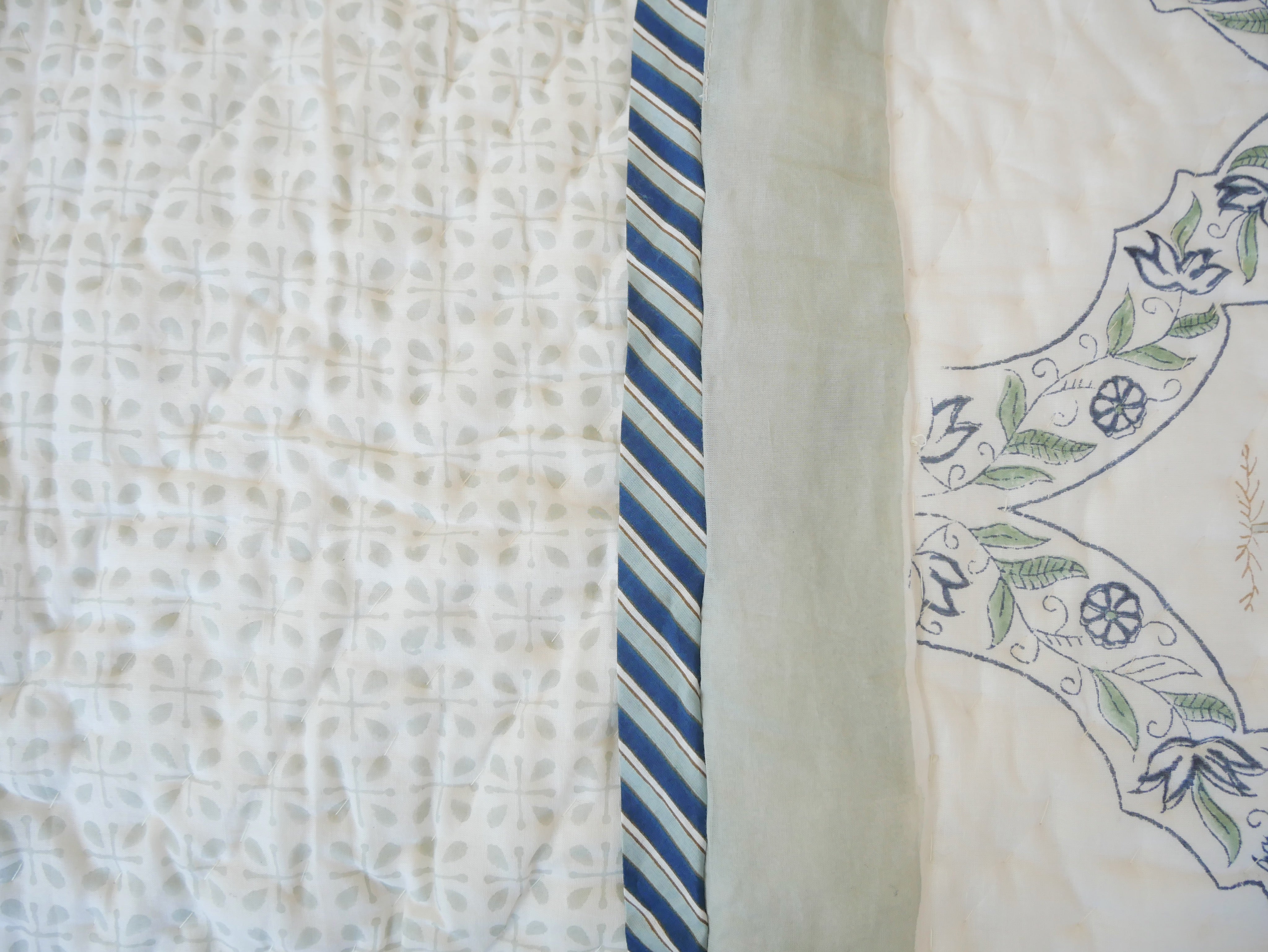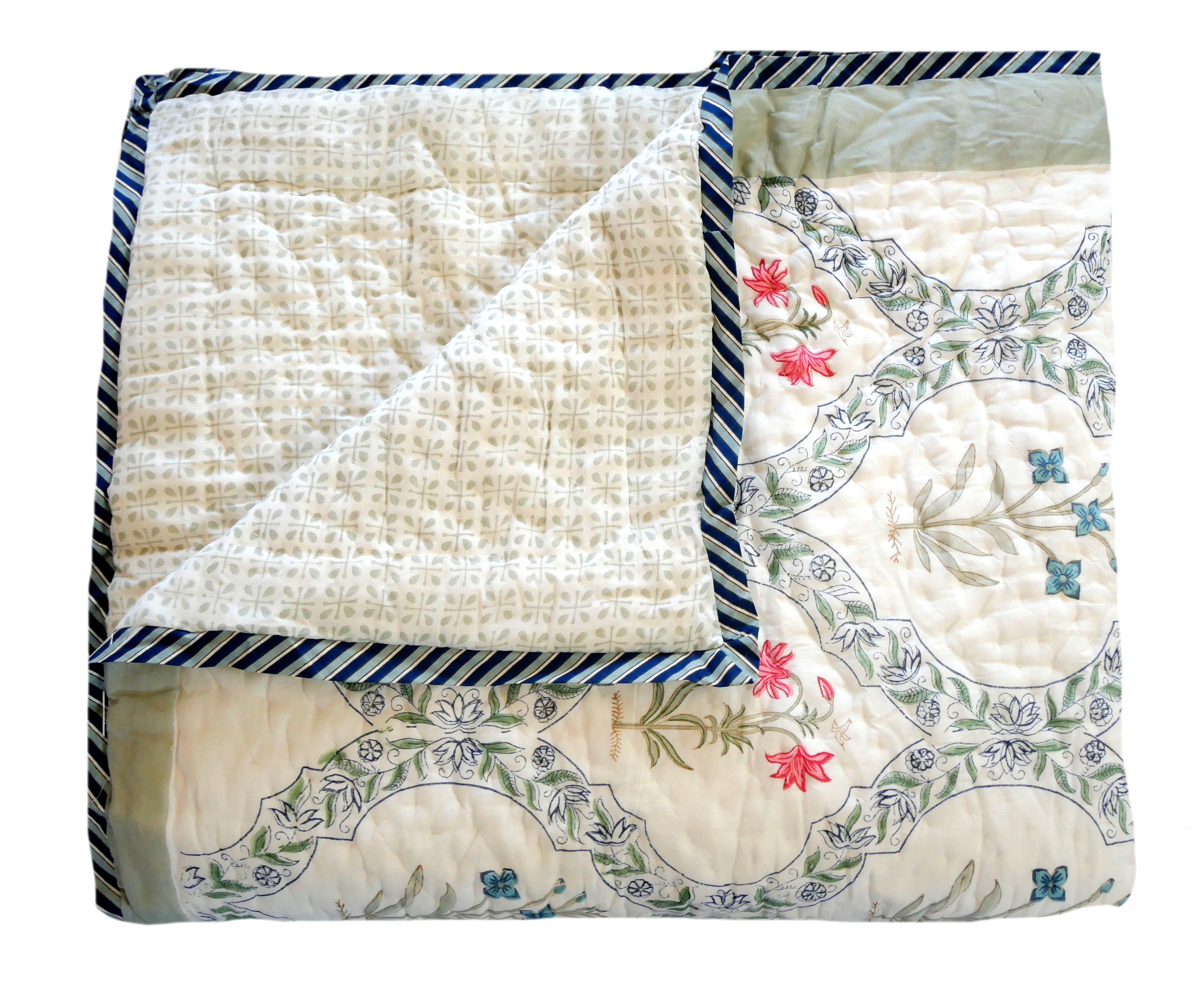 De quilt is aan beide kanten uitvoerig met de hand bedrukt in verschillende patronen die kenmerkend zijn voor Rajasthan en kan daarom worden gedraaid, zoals u op onze foto's kunt zien.