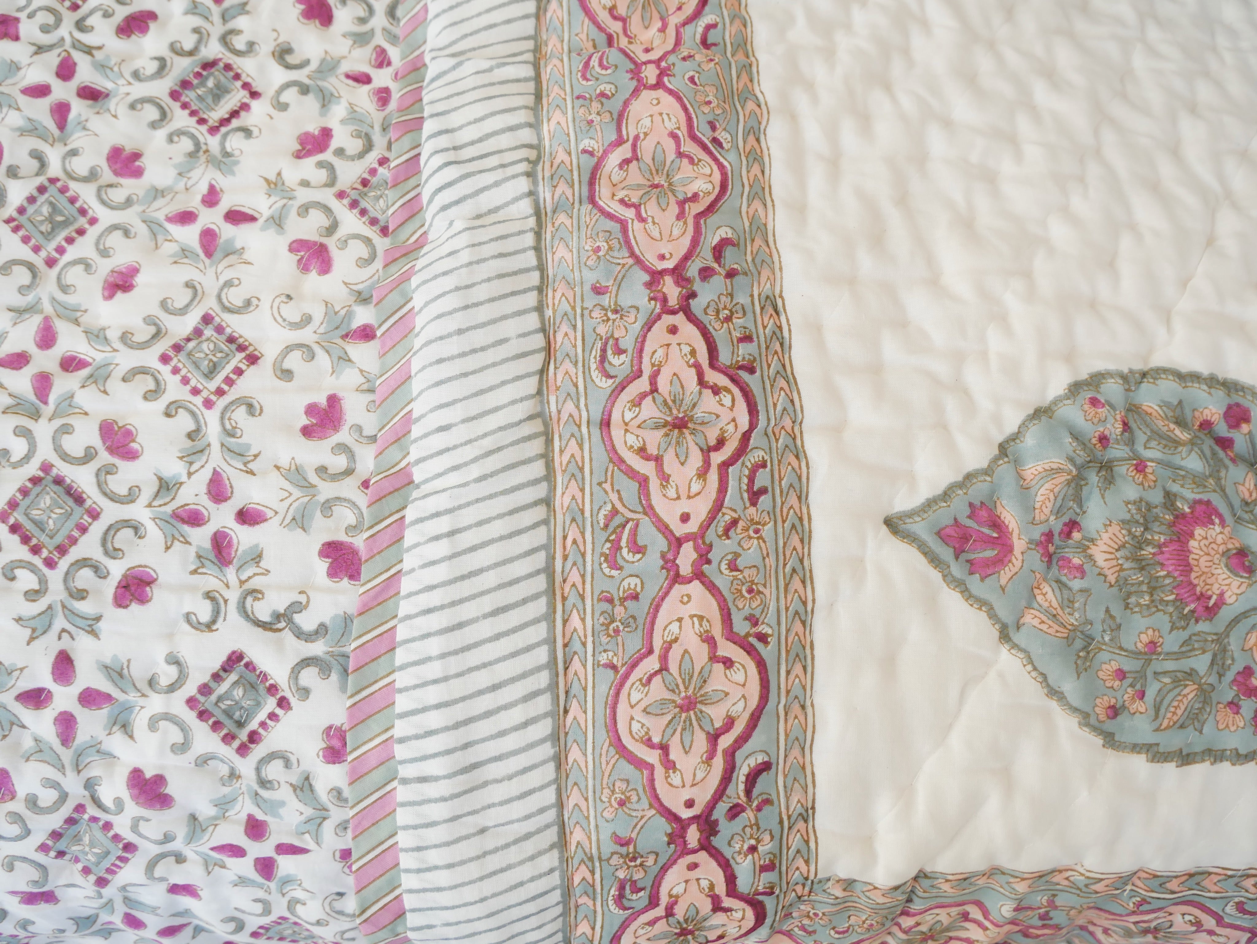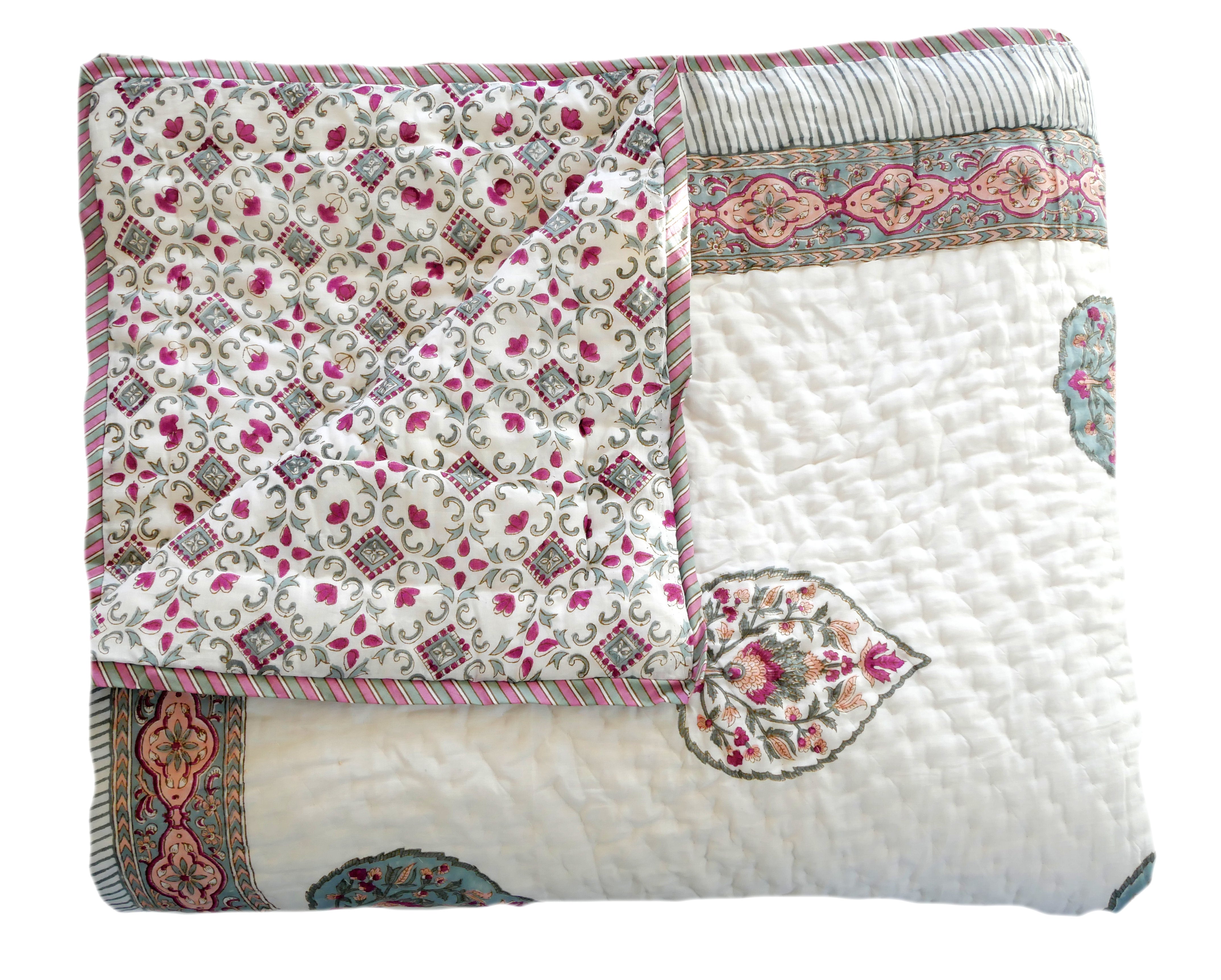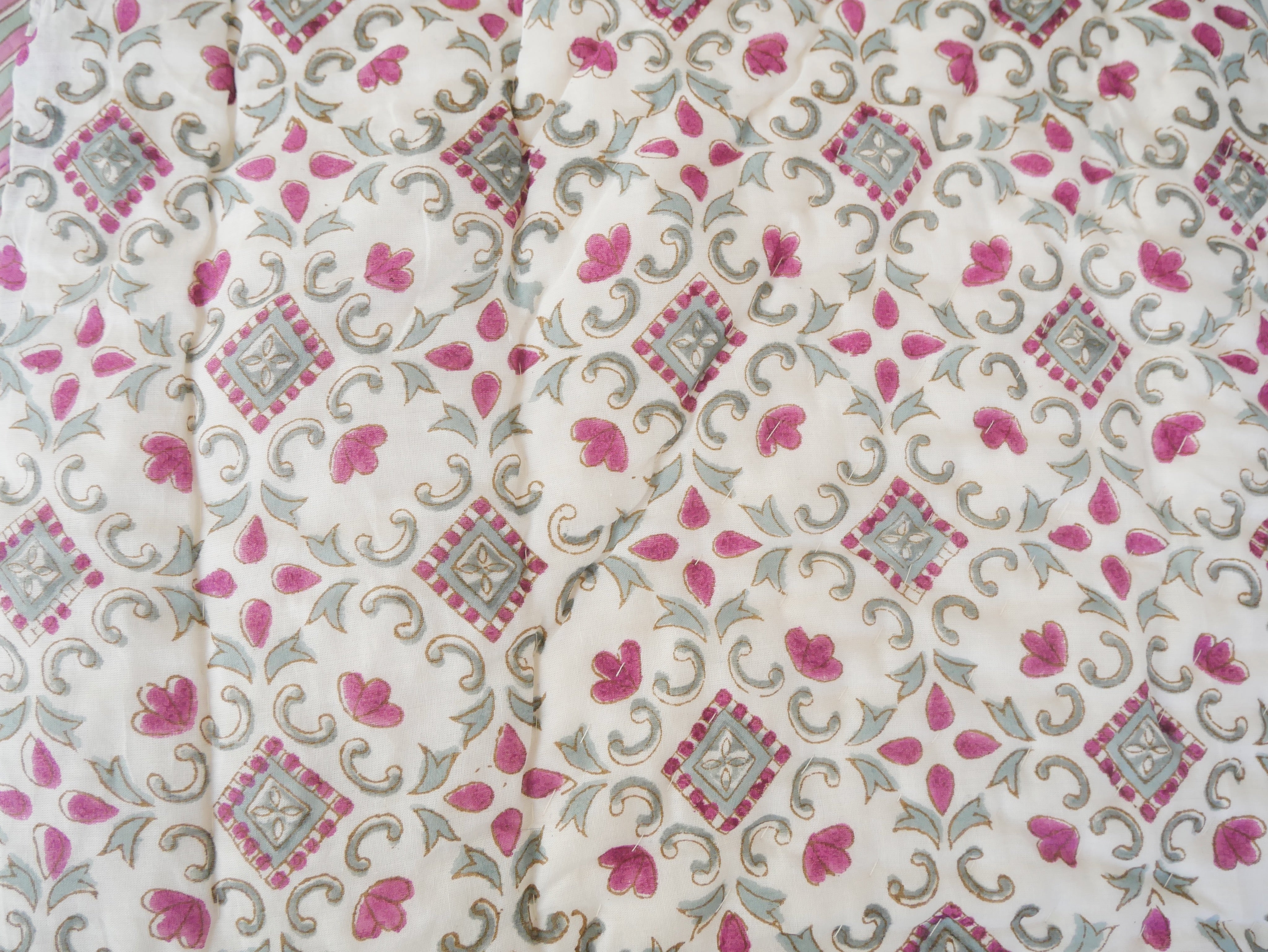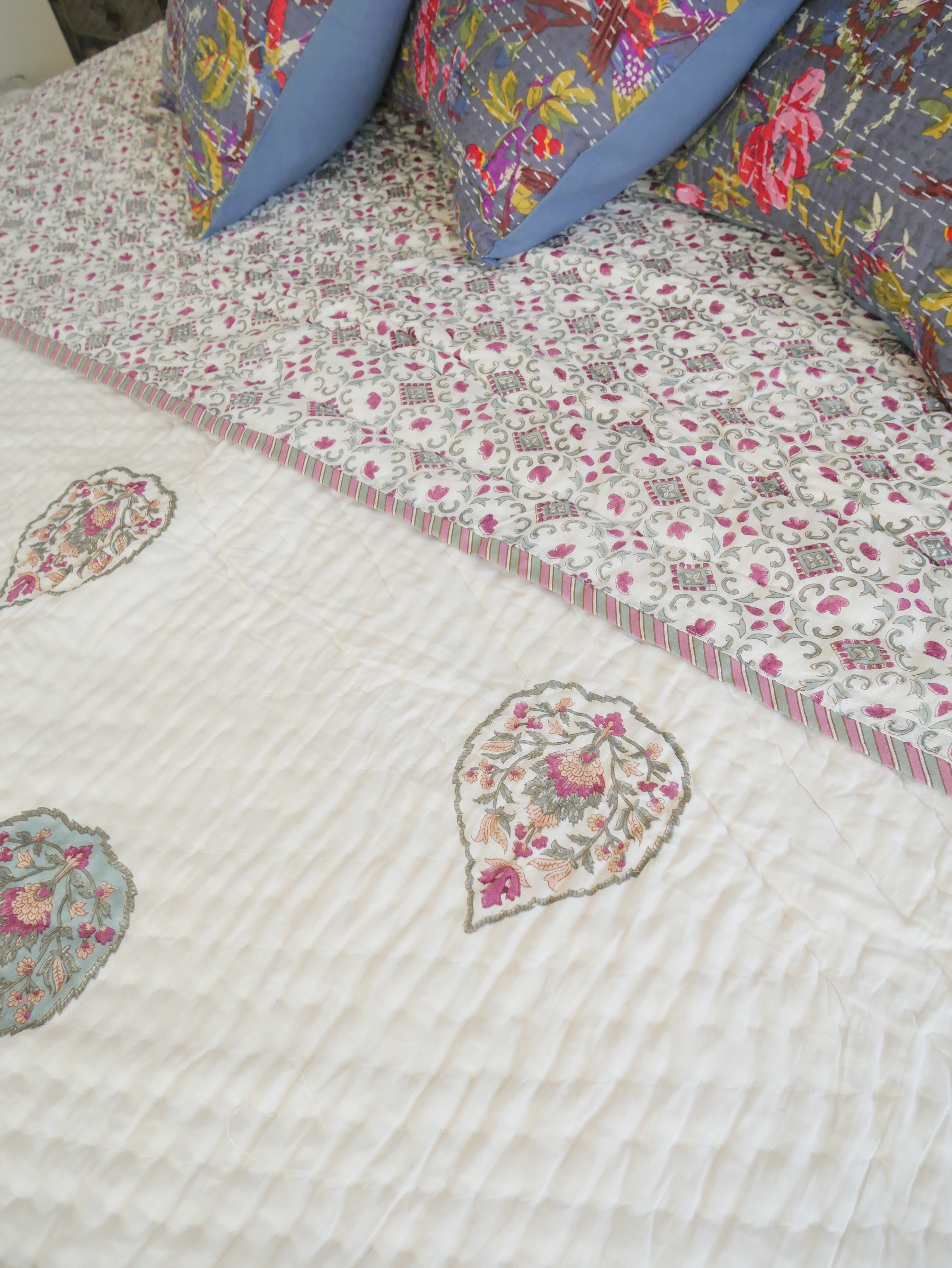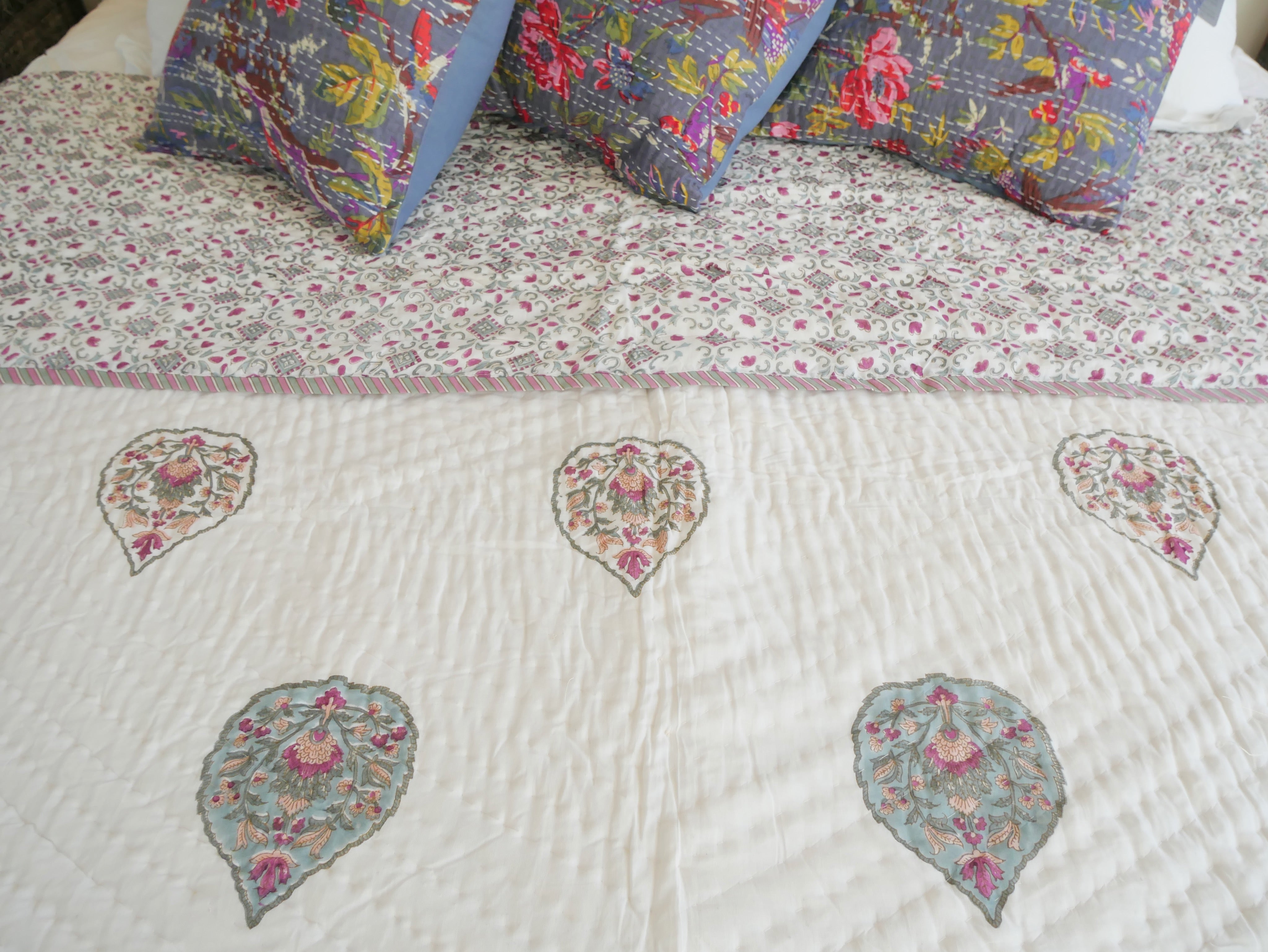 De quilt is aan beide kanten uitvoerig met de hand bedrukt in verschillende patronen die kenmerkend zijn voor Rajasthan en kan daarom worden gedraaid, zoals u op onze foto's kunt zien.