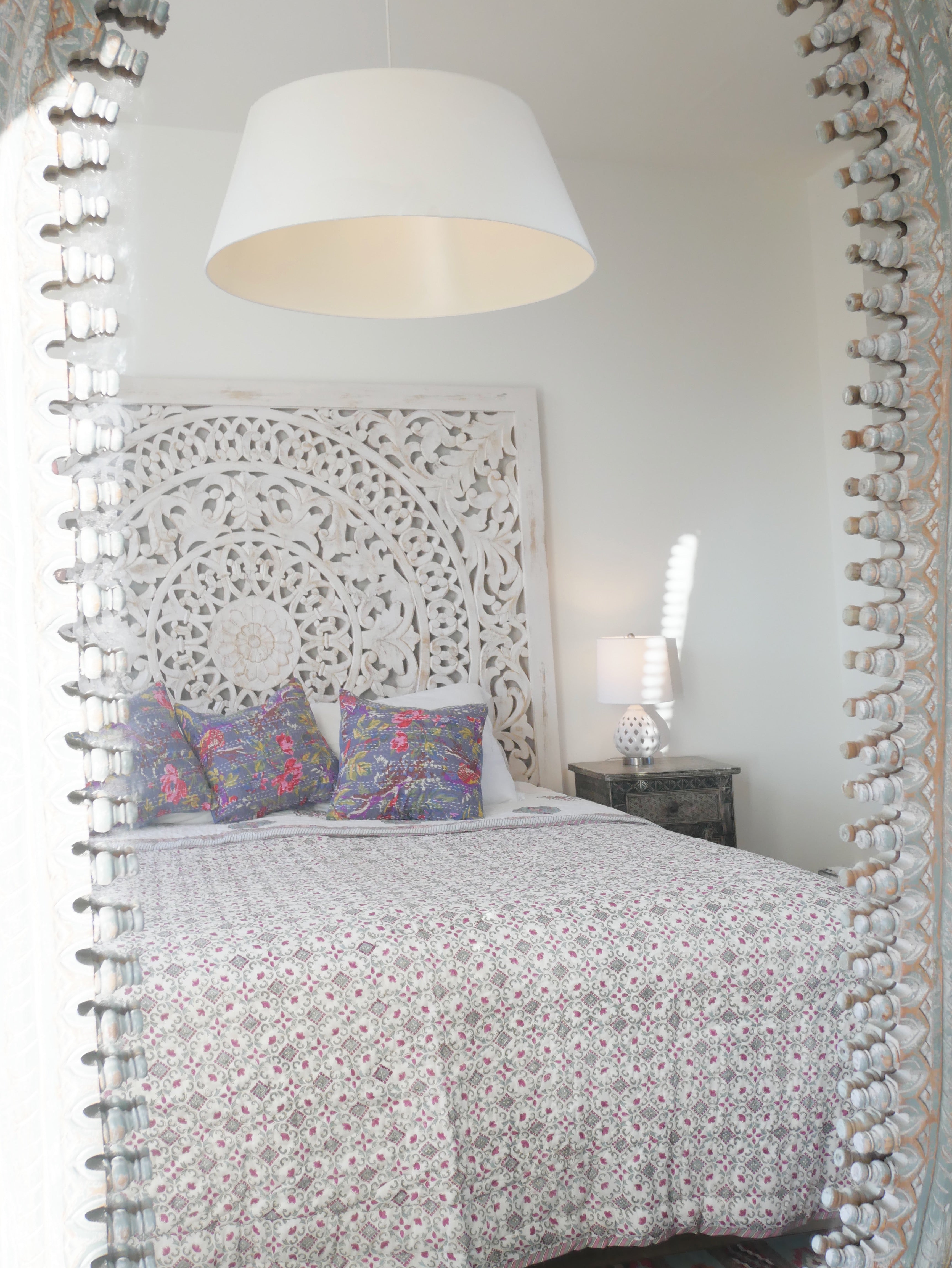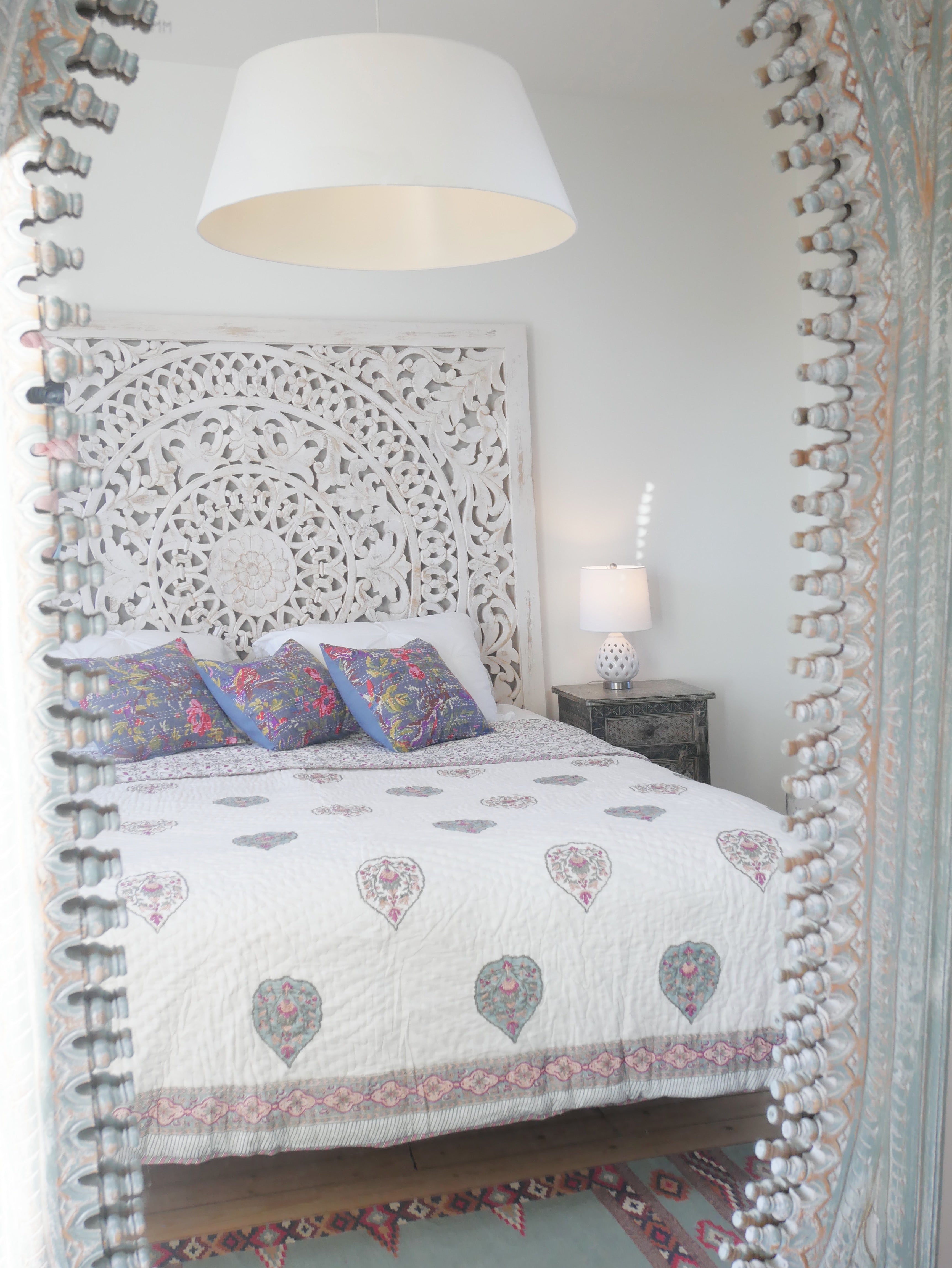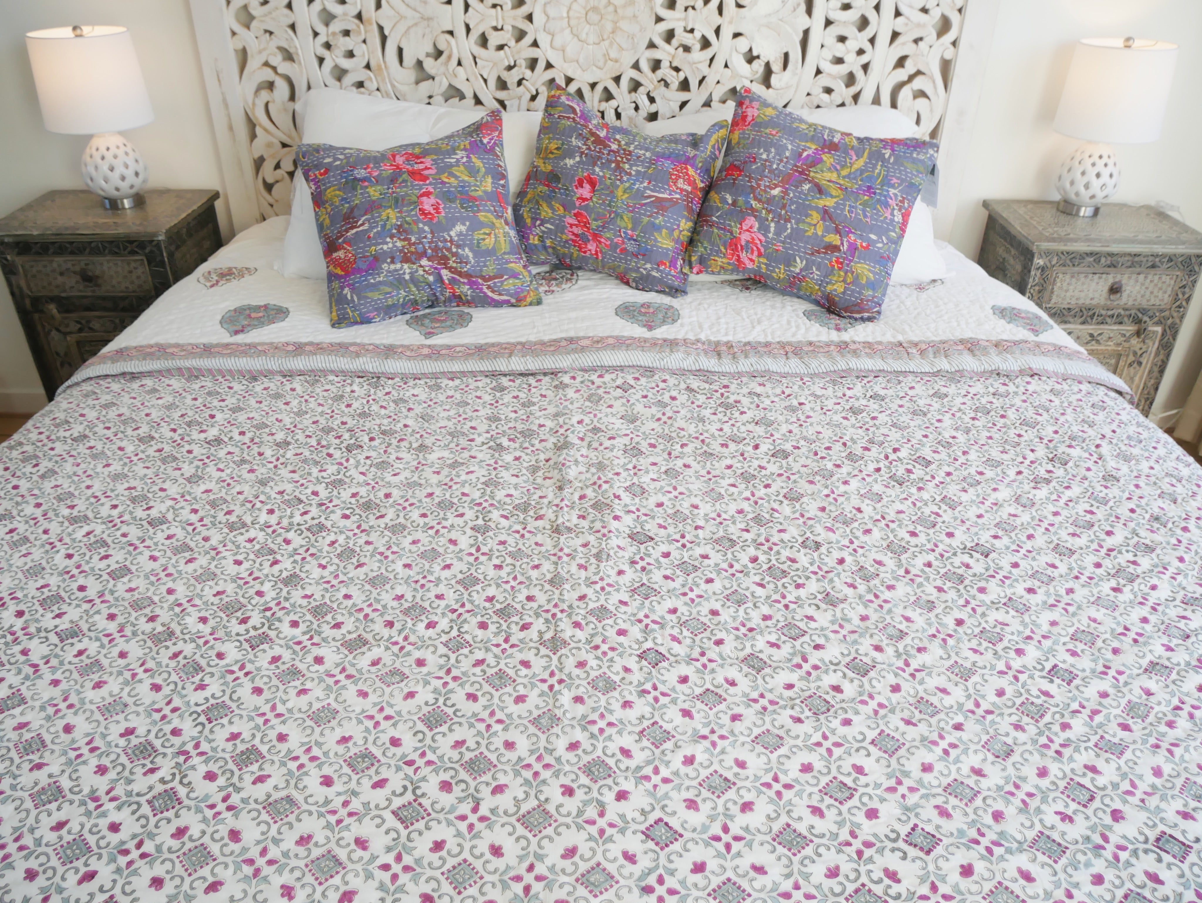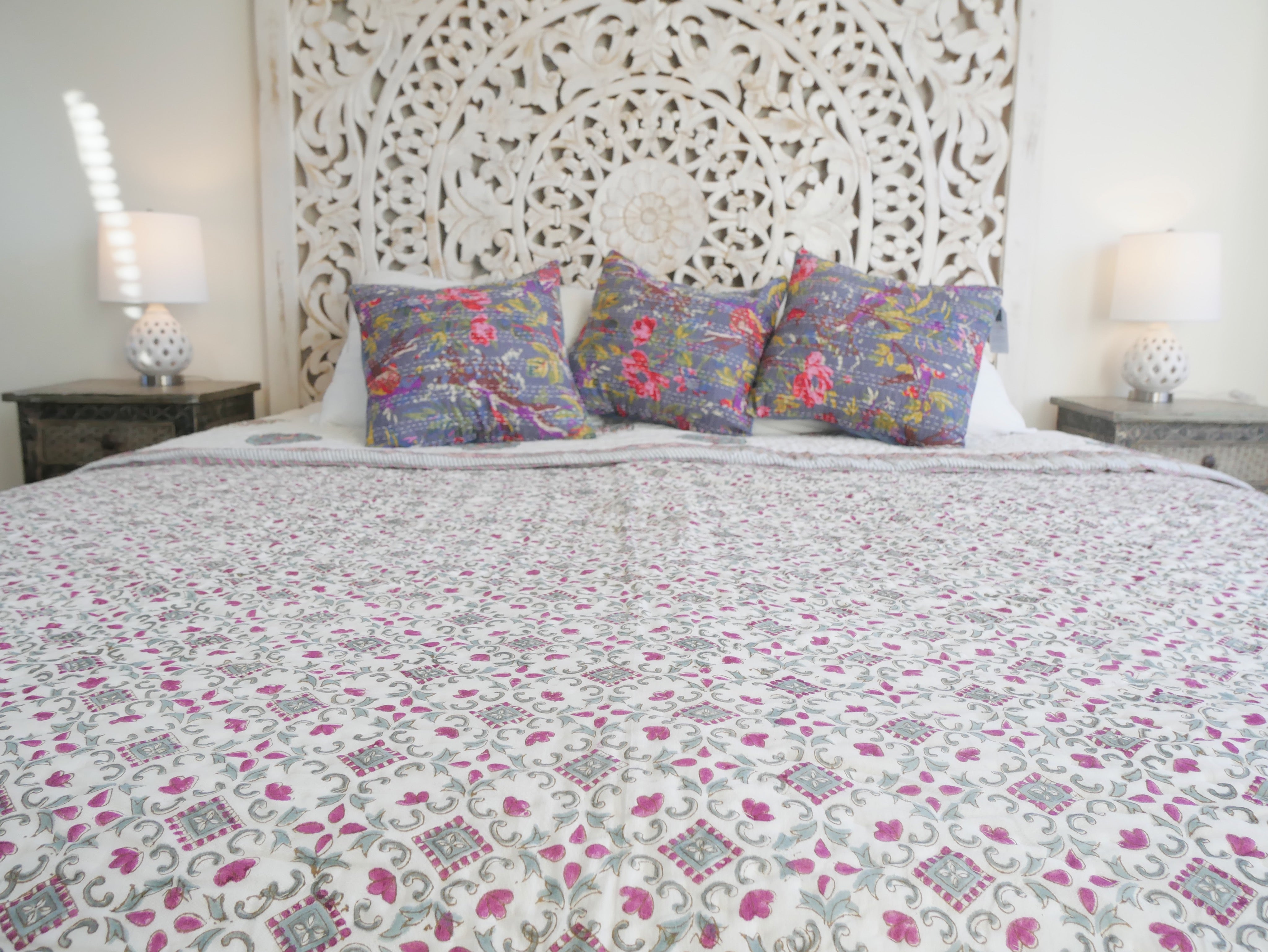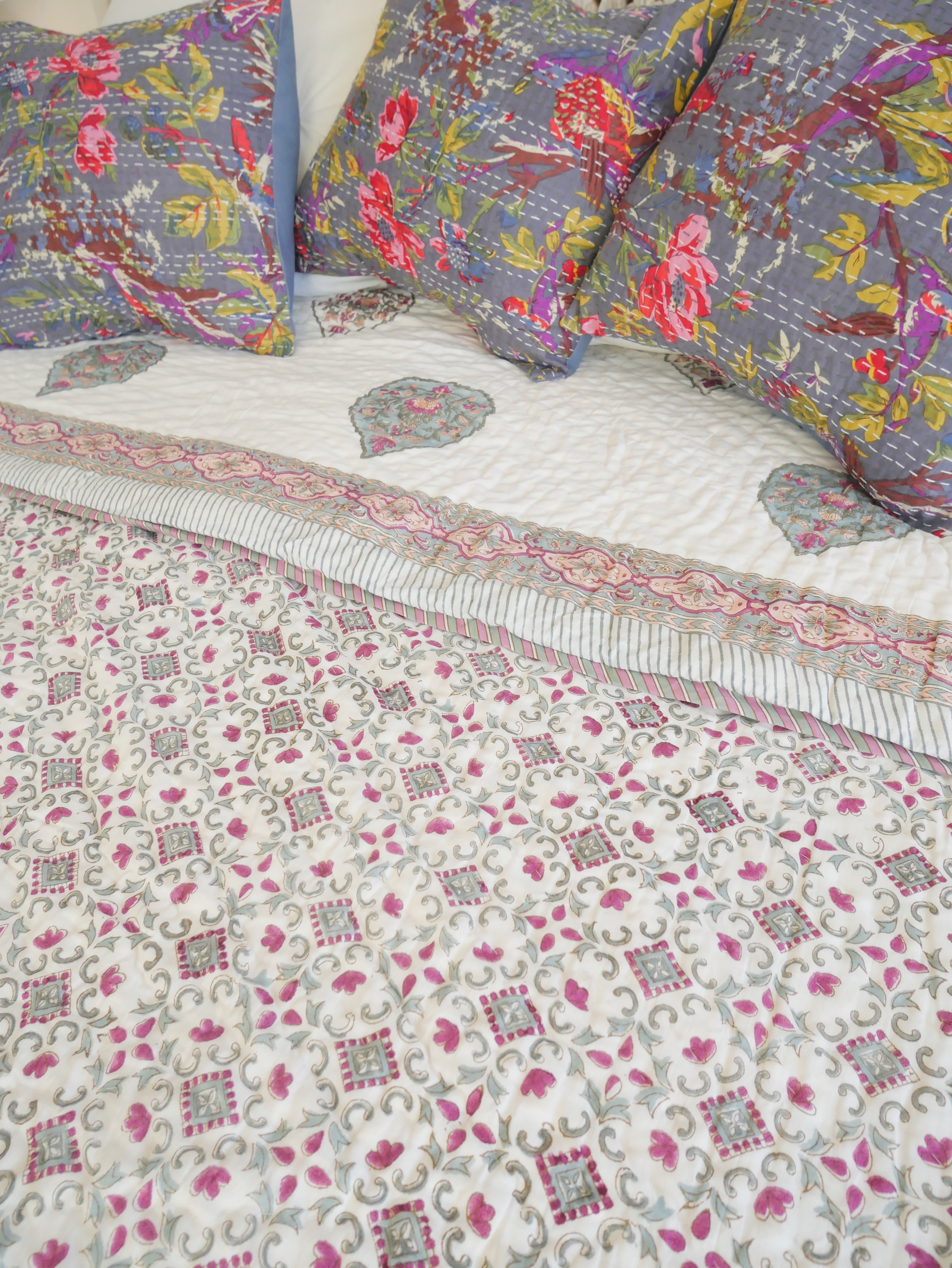 De quilt is aan beide kanten uitvoerig met de hand bedrukt in verschillende patronen die kenmerkend zijn voor Rajasthan en kan daarom worden gedraaid, zoals u op onze foto's kunt zien.