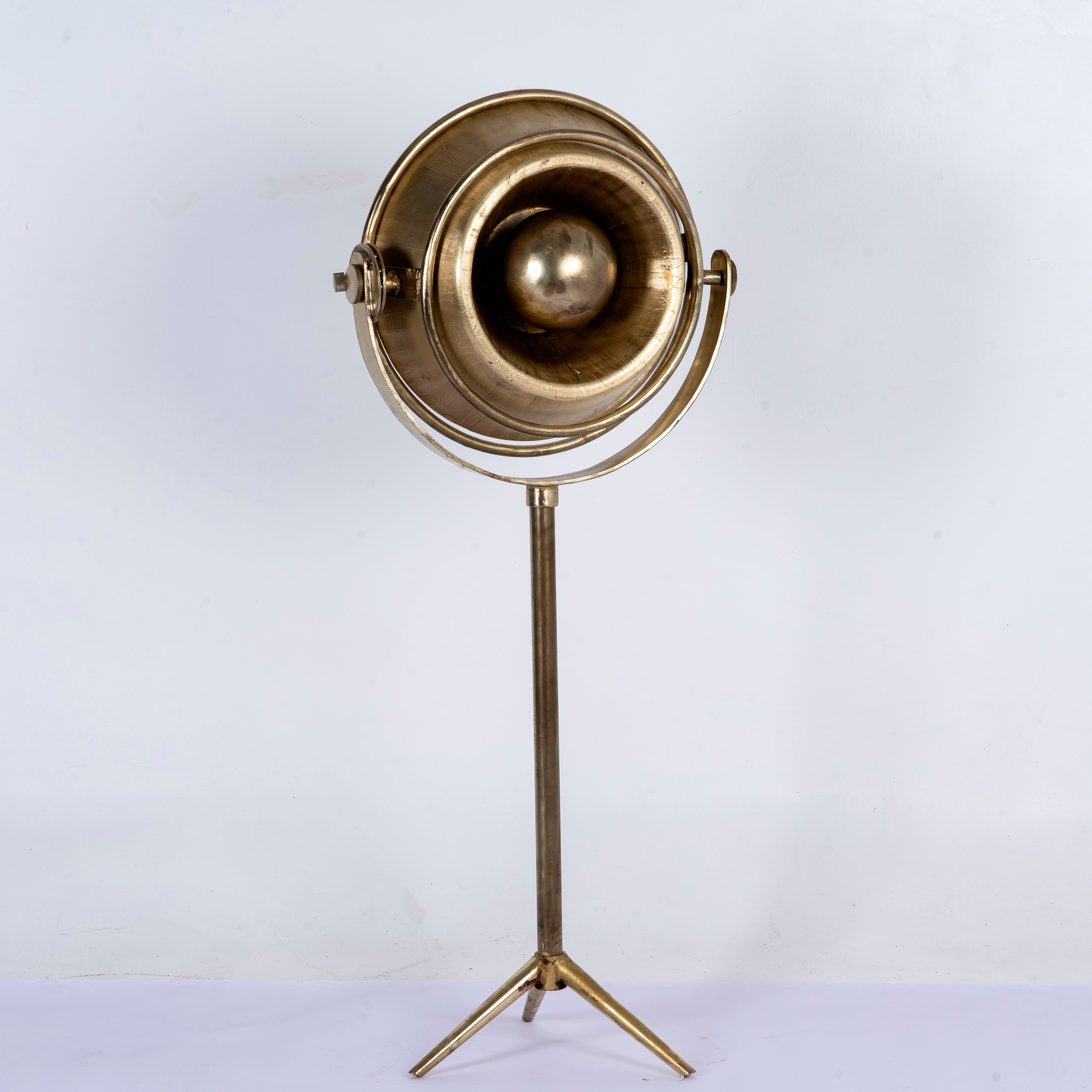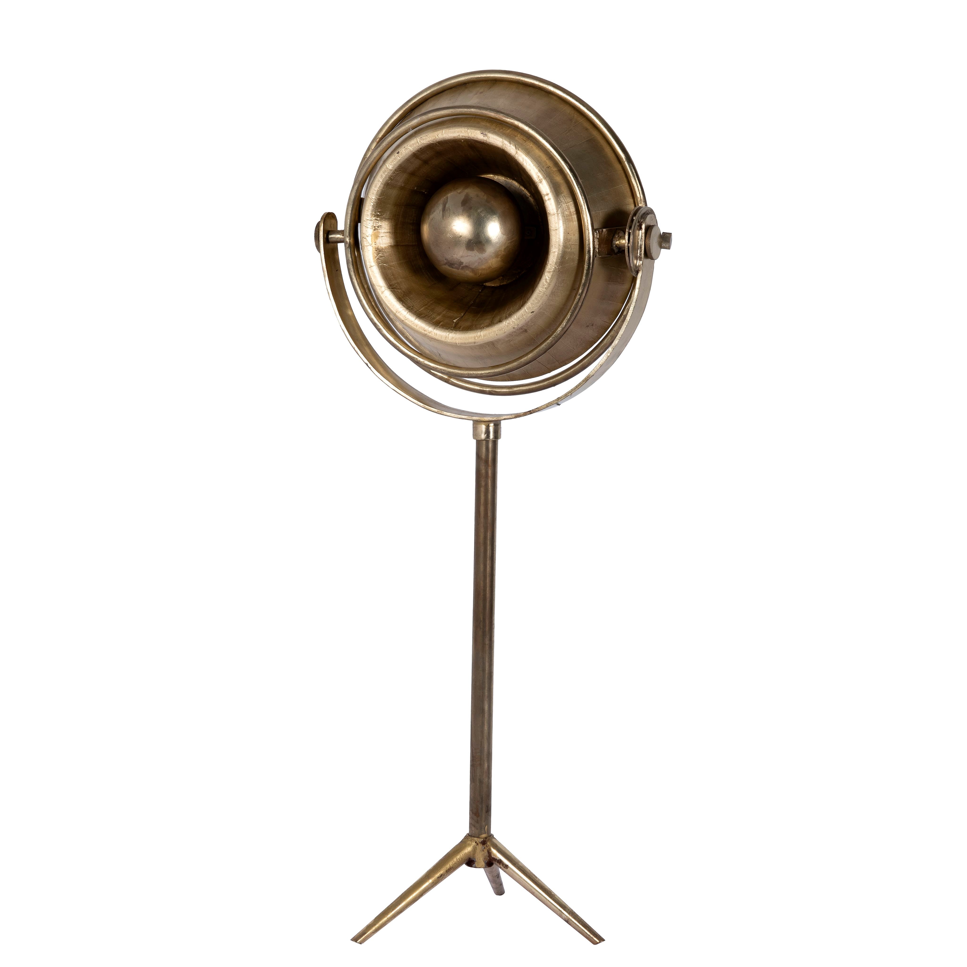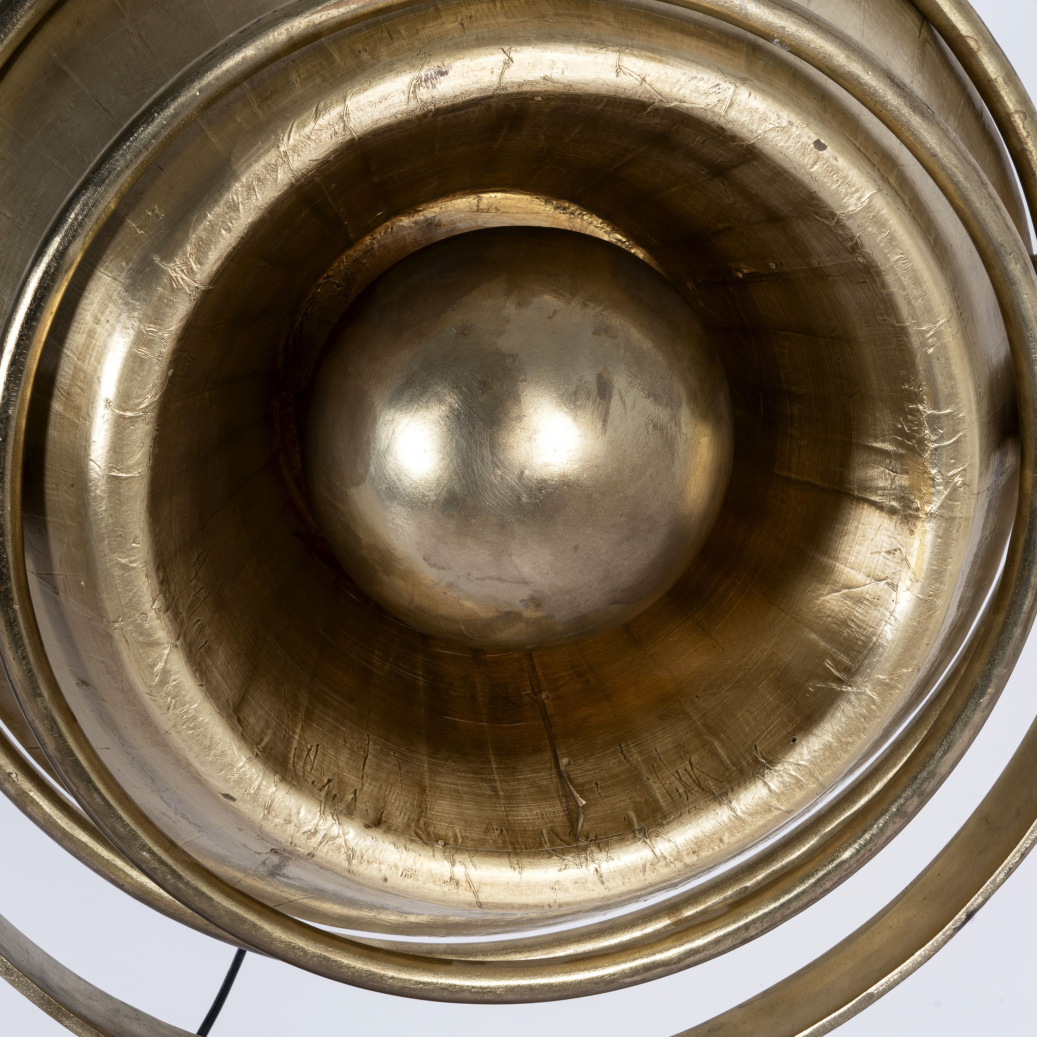 De kap is elegant bekleed met messing, wat een luxueus contrast vormt met het natuurlijke hout. Deze koperen bekleding versterkt niet alleen het verfijnde uiterlijk van de lamp, maar reflecteert ook het licht prachtig, waardoor een warme, uitnodigende gloed aan elke ruimte wordt toegevoegd. De lamp staat op een stevige standaard, die stabiliteit garandeert en het algehele ontwerp aanvult met zijn strakke lijnen en strakke afwerking.