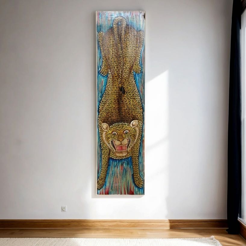 Introductie van ons prachtige, fijn met de hand beschilderde tijgerwandpaneel Vanij, een waar meesterwerk dat artisticiteit combineert met de rijke geschiedenis van hergebruikt teakhout. Dit verbluffende wandpaneel is gemaakt van een oude Indiase teakhouten halve huisdeur, hergebruikt om een uniek en boeiend decorstuk te creëren. Het inherente karakter en de tijdloze schoonheid van teakhout worden bewaard en gevierd in deze buitengewone creatie.