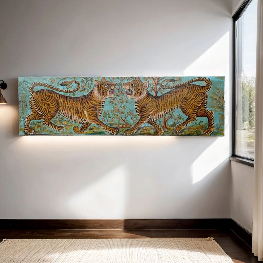 Maak kennis met ons prachtige, fijn met de hand beschilderde tijgerwandpaneel Virat, een waar meesterwerk dat artisticiteit combineert met de rijke geschiedenis van hergebruikt teakhout. Dit verbluffende wandpaneel is gemaakt van een oude Indiase teakhouten halve huisdeur, hergebruikt om een uniek en boeiend decorstuk te creëren. Het inherente karakter en de tijdloze schoonheid van teakhout worden bewaard en gevierd in deze buitengewone creatie.