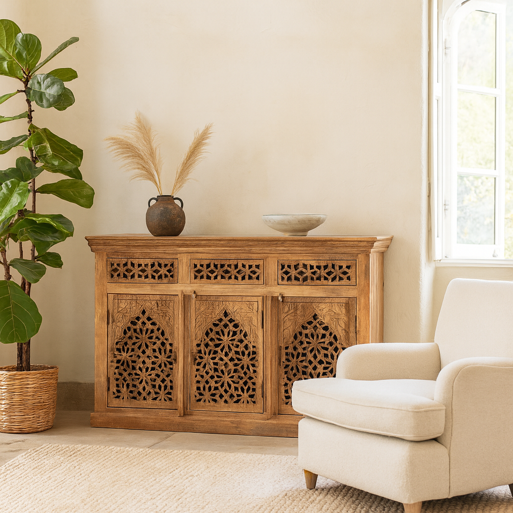 Haal een oosterse sfeer in huis met dit prachtige handgesneden mangohouten "KAVERI" dressoir. Met 6 vakken en 3 lades biedt het veel opbergruimte. Dit handgemaakte product is uniek.