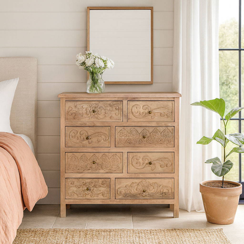 Gemaakt van massief mangohout, is deze kist gebouwd om lang mee te gaan, waarbij de natuurlijke schoonheid van de houtnerf wordt getoond. De mix van sierlijke bloemen en geometrische houtsnijwerken op elke lade en de deur geeft het een ambachtelijke, vintage-geïnspireerde look. Perfect voor bohemian, rustieke of eclectische interieurs, deze veelzijdige kist is ideaal voor het opbergen van essentials terwijl het uw decor verbetert.