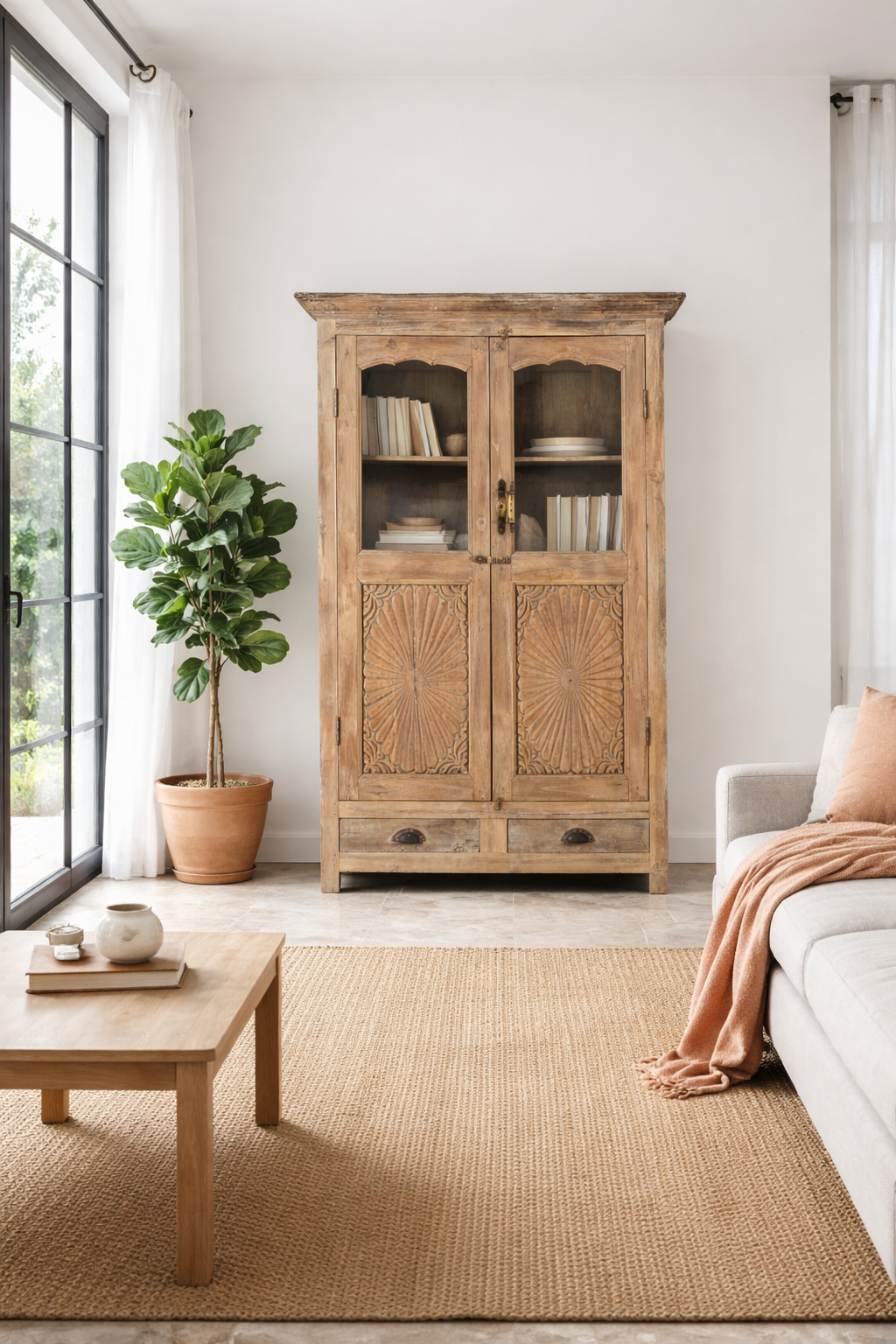 Introducing our refurbished teak wood showcase Aasta, a timeless piece of reclaimed teak wood furniture that captures the essence of Mediterranean charm and traditional Indian artistry. Lovingly restored from solid antique teak, Aasta features hand-carved door panels with intricate fan-shaped motifs, adding depth, elegance, and history to any interior.