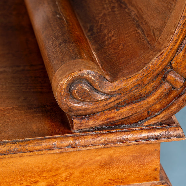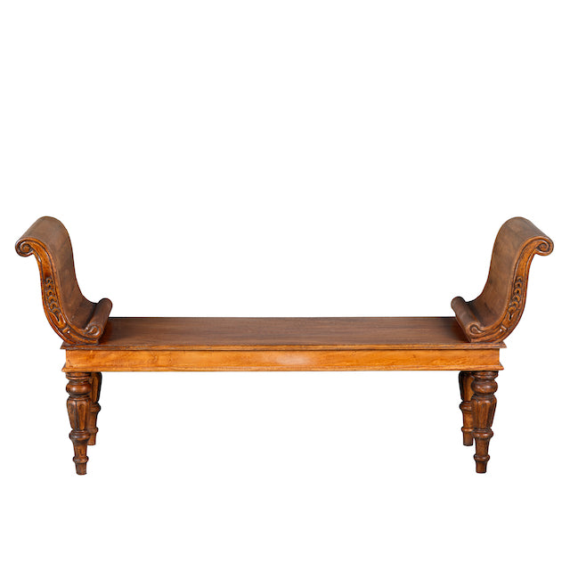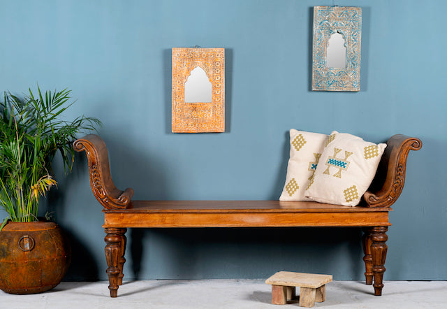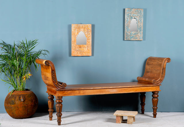 Deze antieke Indiase teakhouten bank Swabi maakt indruk met een prachtig gesneden frame en elegant gedraaide poten. De bank is vakkundig gerestaureerd en behandeld met bijenwas, waardoor hij een warme honingkleur en een gladde afwerking heeft.
