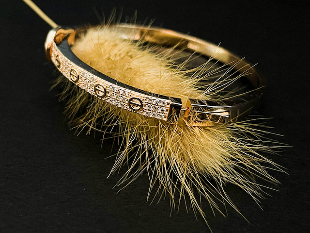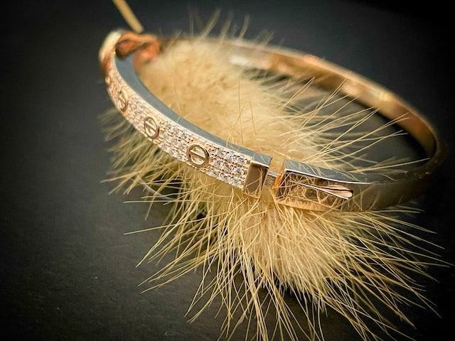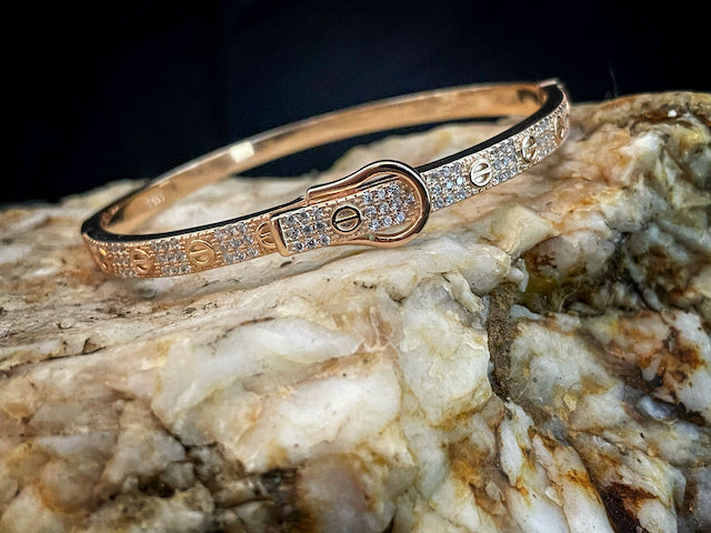 Deze elegante vergulde zilveren bangle, delicaat versierd met glinsterende zirkonia-stenen, is een ware weergave van verfijnd vakmanschap. Ontworpen om de iconische stijl van een riemgesp na te bootsen, combineert het klassieke mode met sieradenontwerp, waardoor een veelzijdig accessoire ontstaat dat een vleugje verfijning toevoegt aan elke outfit.