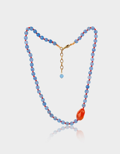 Blauwe chalcedoon en carneool op oranje katoendraad.