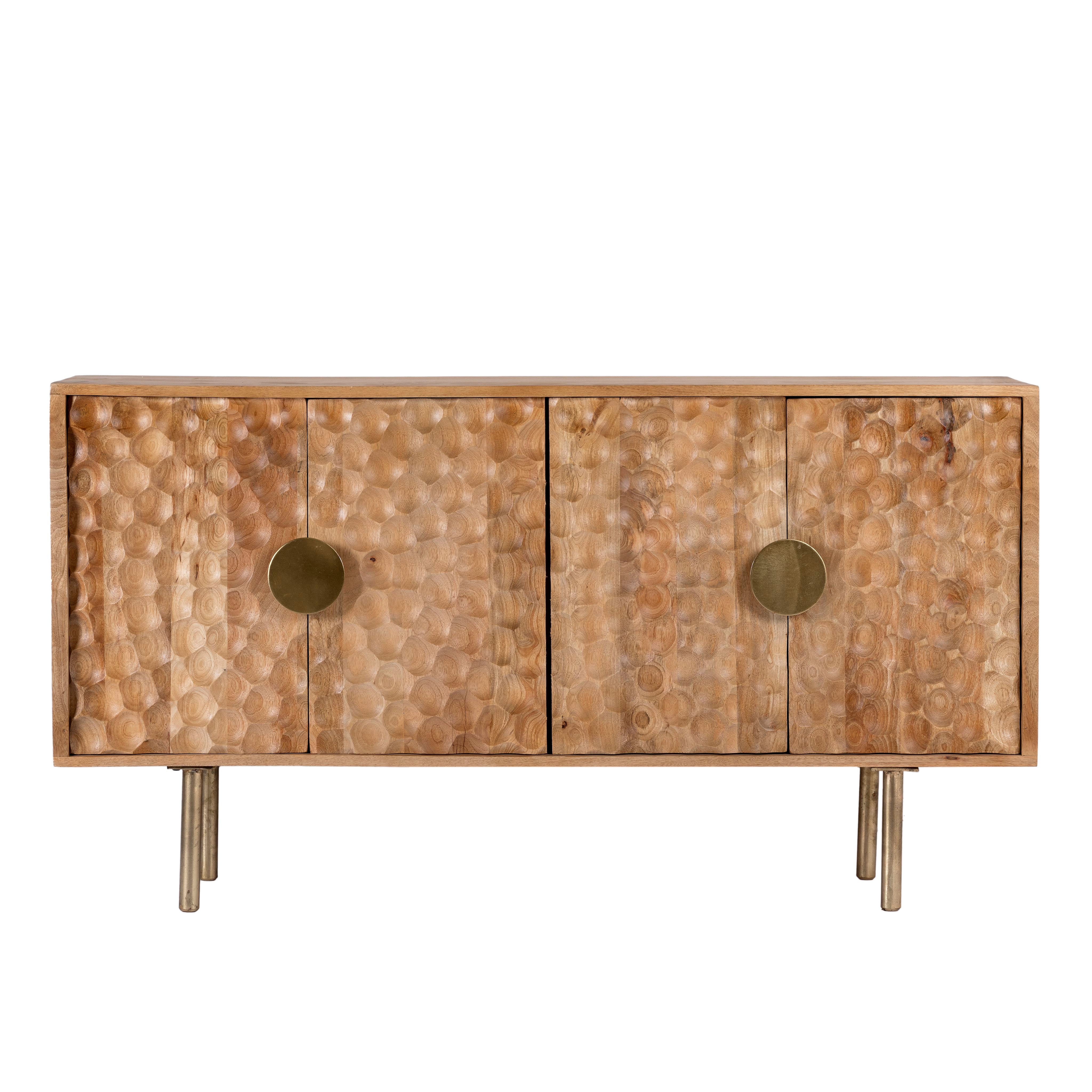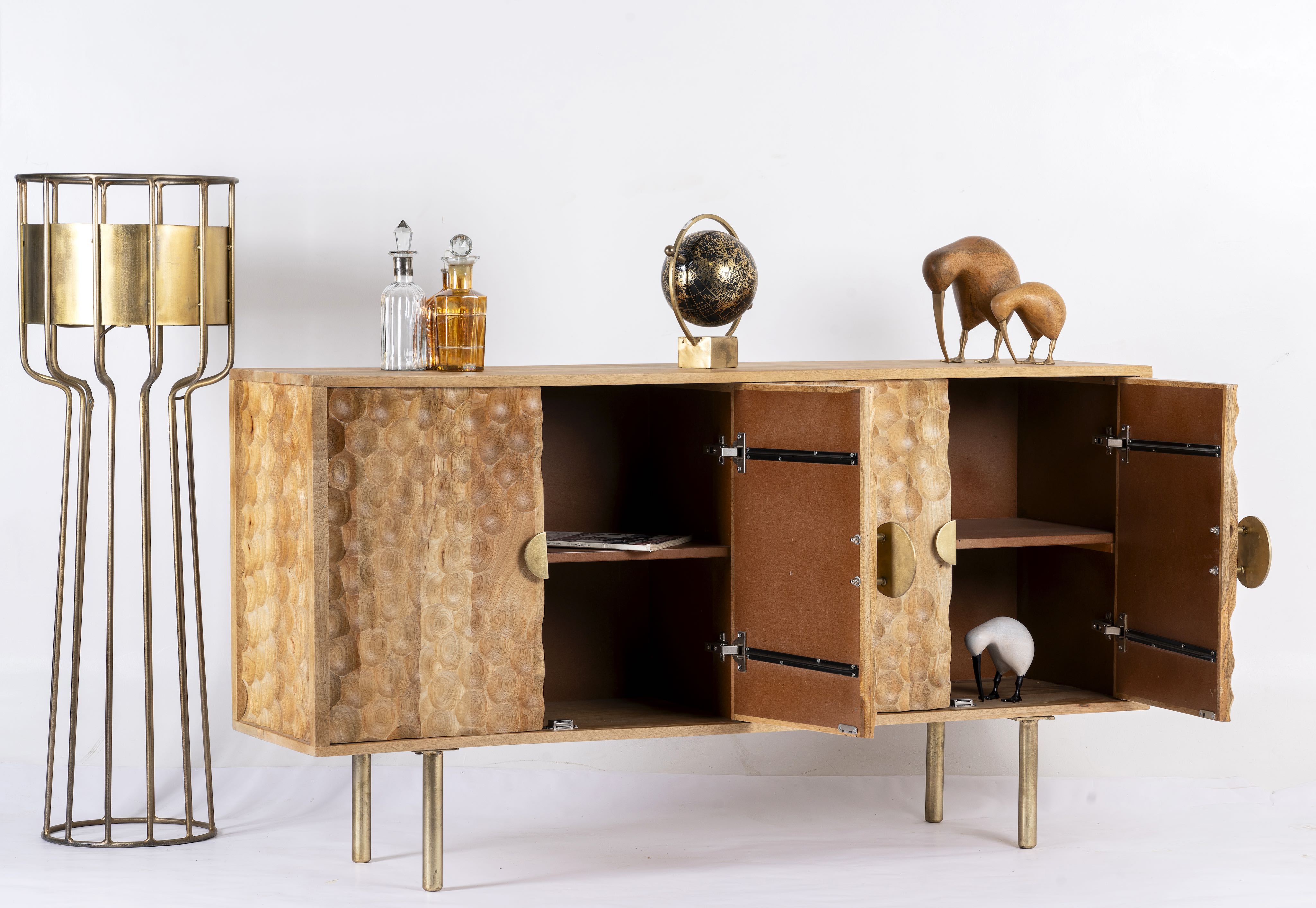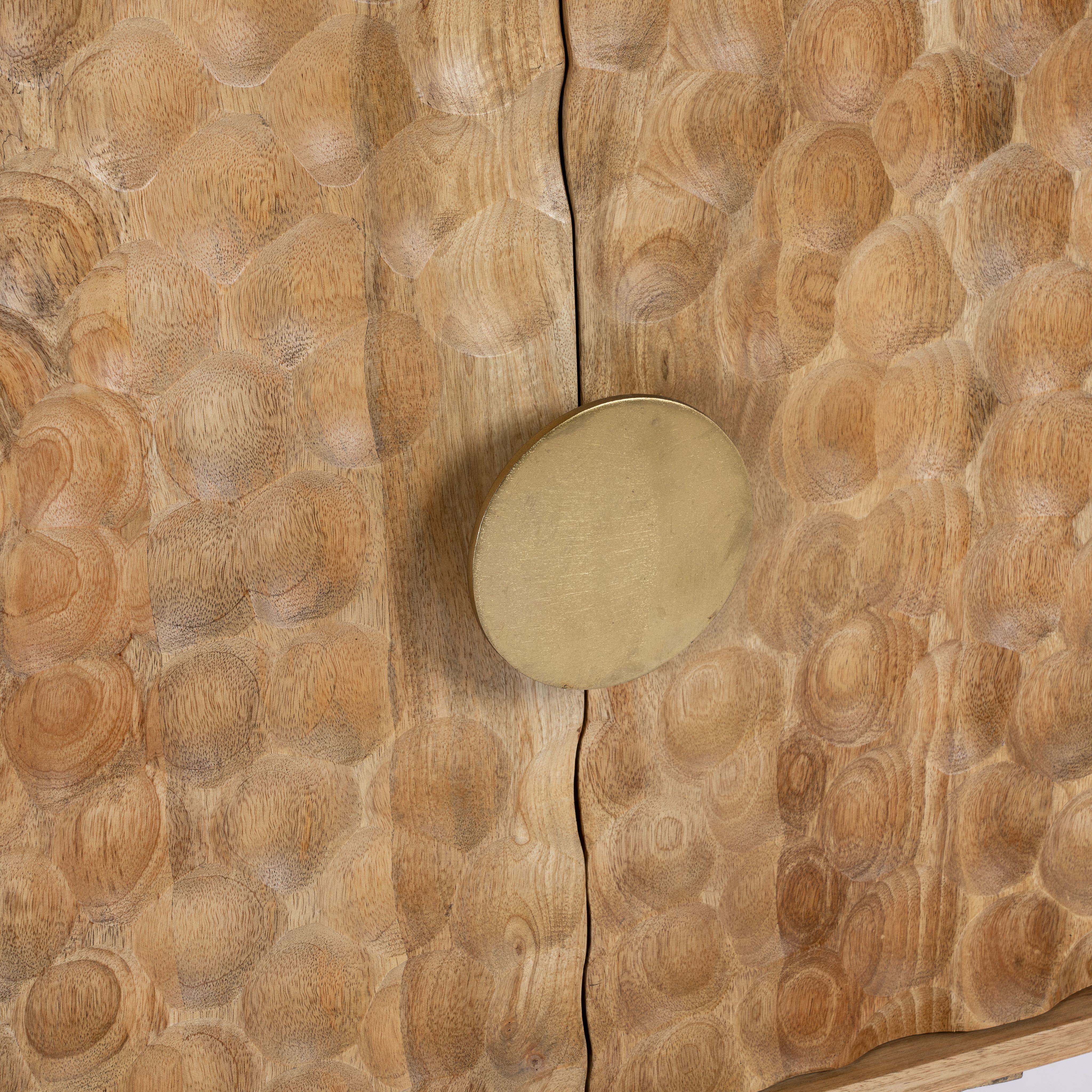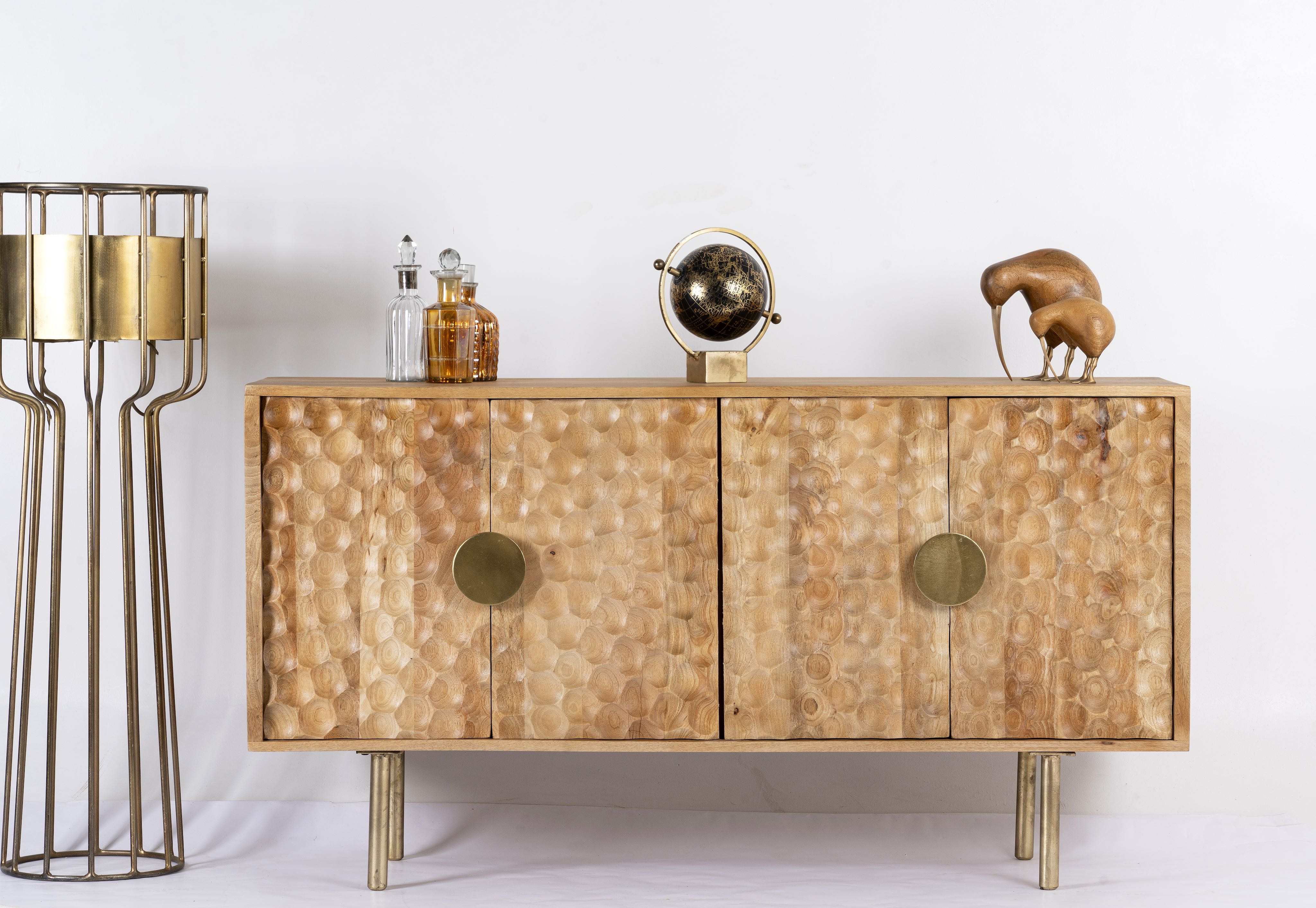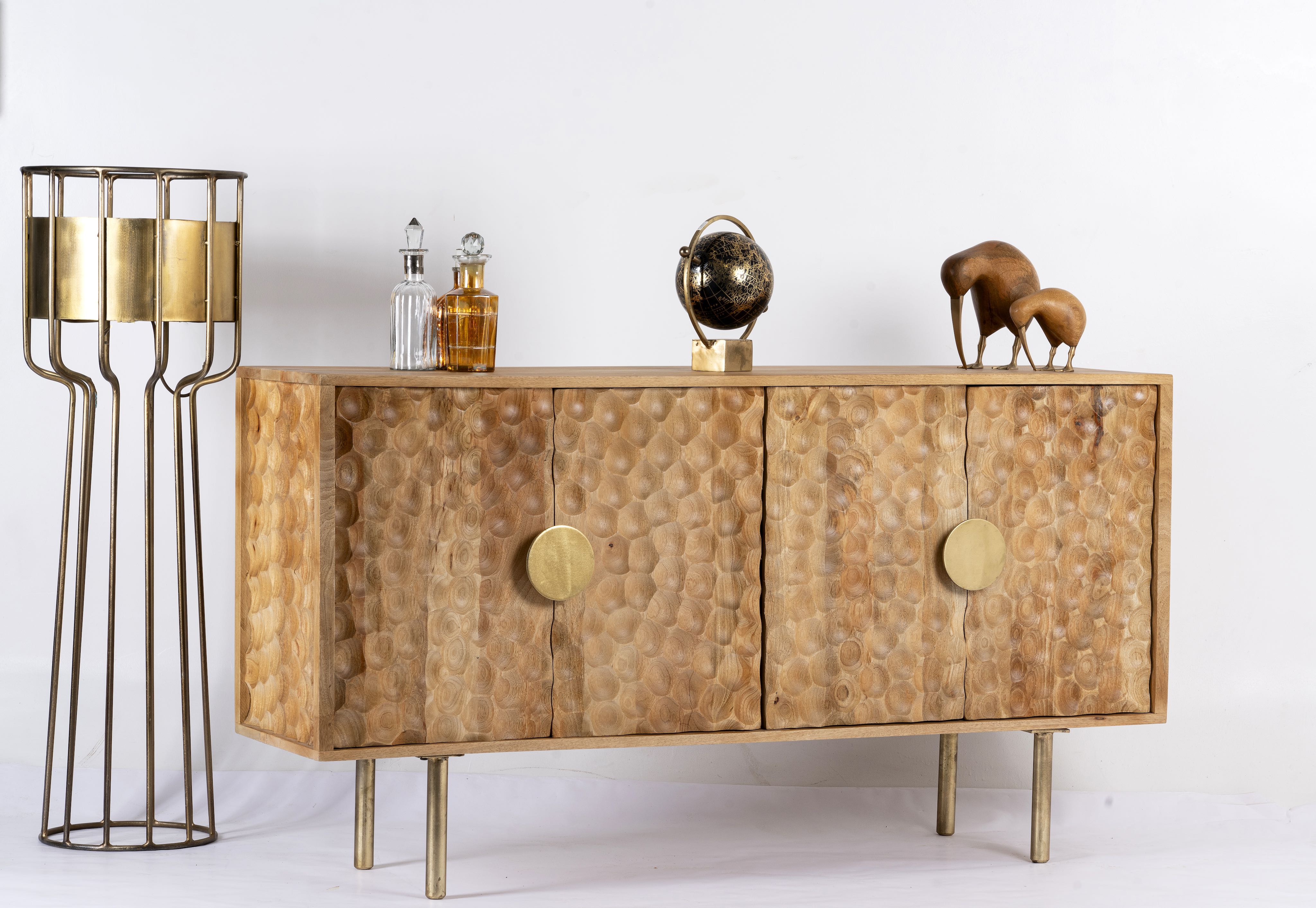 Dit opvallende dressoir met 4 deuren is gemaakt van natuurlijk mango hout en heeft een met de hand afgewerkt gehamerd ontwerp op de voorpanelen. De unieke esthetiek combineert ambachtelijk vakmanschap met moderne elegantie. Verhoogd op een ijzeren frame bedekt met messing, voegt dit hoogwaardige stuk niet alleen stijlvolle functionaliteit toe aan uw ruimte, maar zet het ook een trendsettende toon in elke kamer.