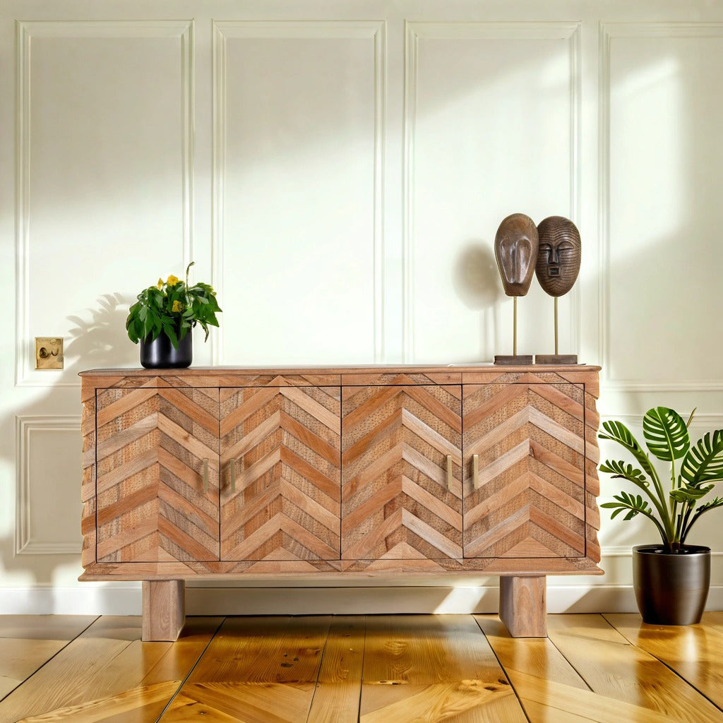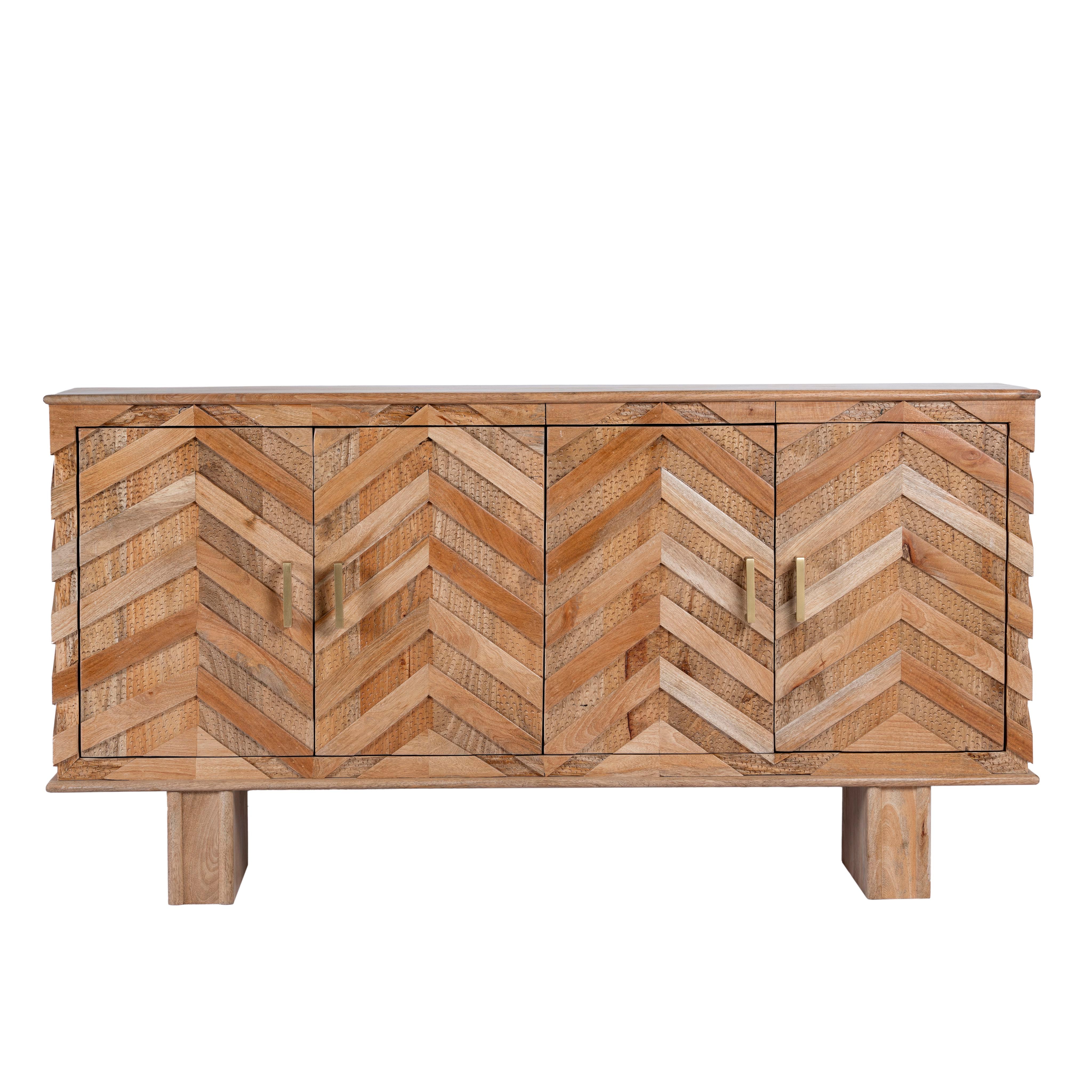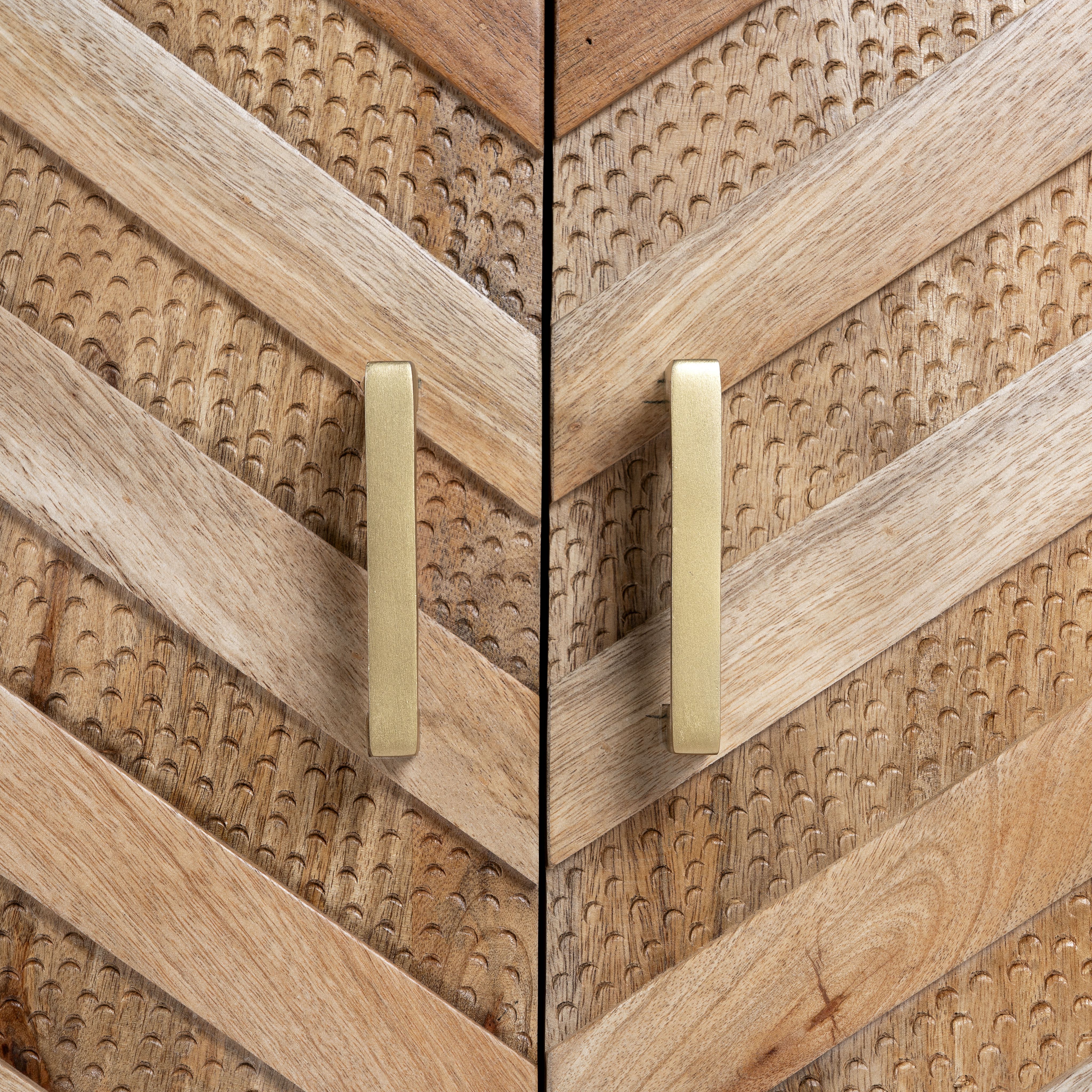 Dit dressoir van natuurlijk mangohout is een uitzonderlijk meubelstuk. Handgemaakt in een opvallend chevron-hamerontwerp, met messing handgrepen die prachtig contrasteren met de natuurlijke honingbruine tint van het hout. Om de look compleet te maken, combineert u het met onze Trariti-spiegel.
