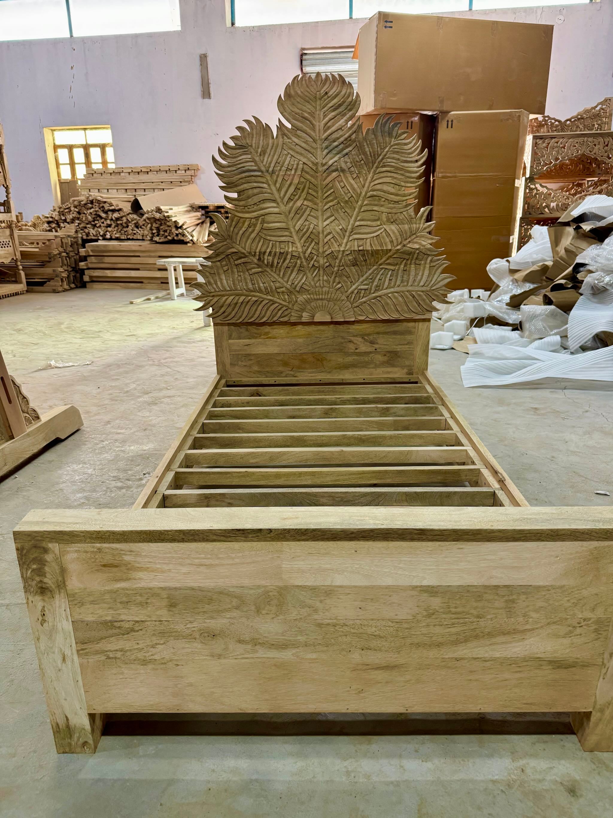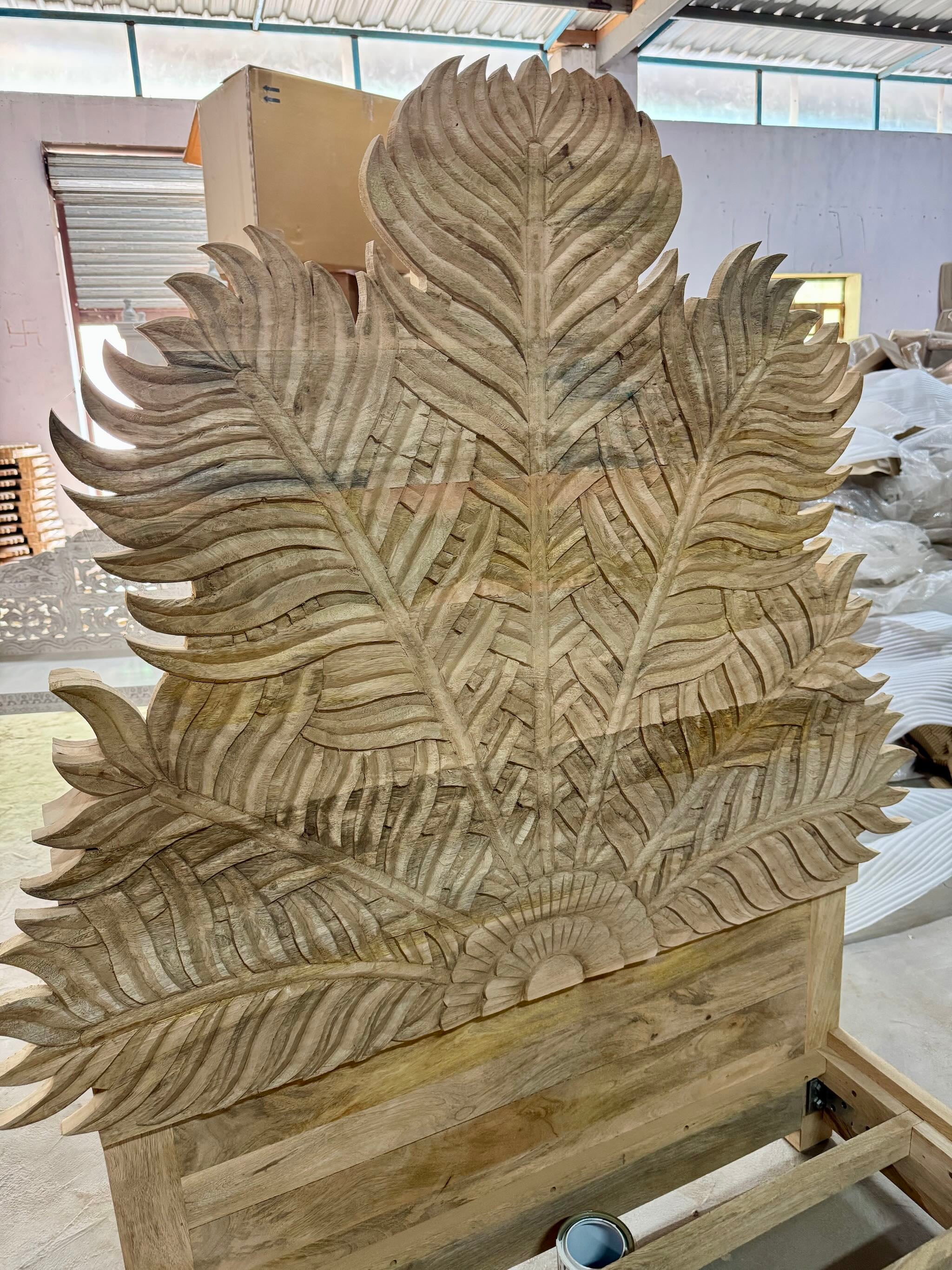 The oversized headboard features a sweeping palm leaf motif, meticulously hand-carved by artisans to highlight the natural beauty of mango wood. As part of our refined collection of hand carved wooden beds, Farn is ideal for those seeking unique, sustainable, and nature-inspired sleep spaces.