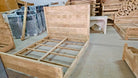 This bed frame is available for preorder and can be fully customized to your preferred dimensions and surface finish, with options including Natural Mango, White Washed, and Sandblasted Bleached finishes. The frame is delivered dismantled and is designed for easy assembly.