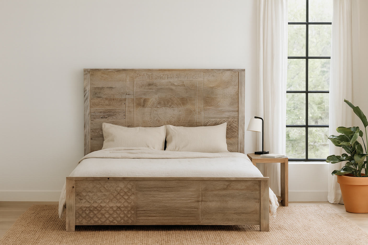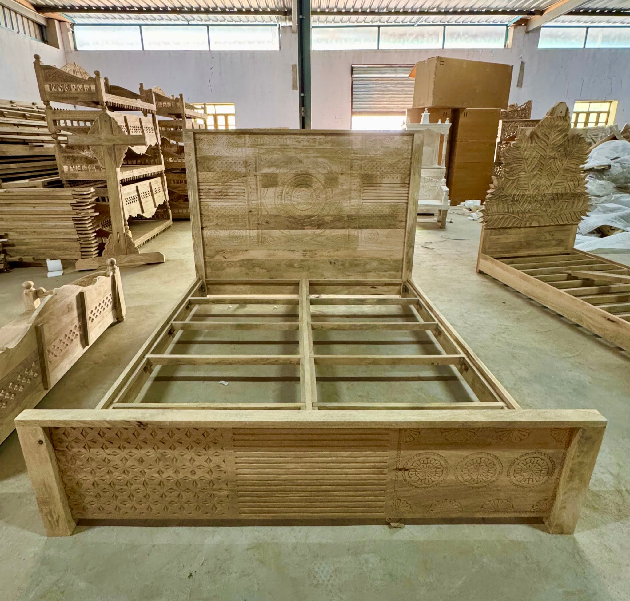 Introducing our bed Garmee, a sculptural wooden kingsize bed frame crafted from solid mango wood and enriched with elaborate hand-carved detailing. Radiating rustic elegance and cultural depth, Garmee brings a grounding presence to any bedroom with its natural textures and intricate artisan patterns.