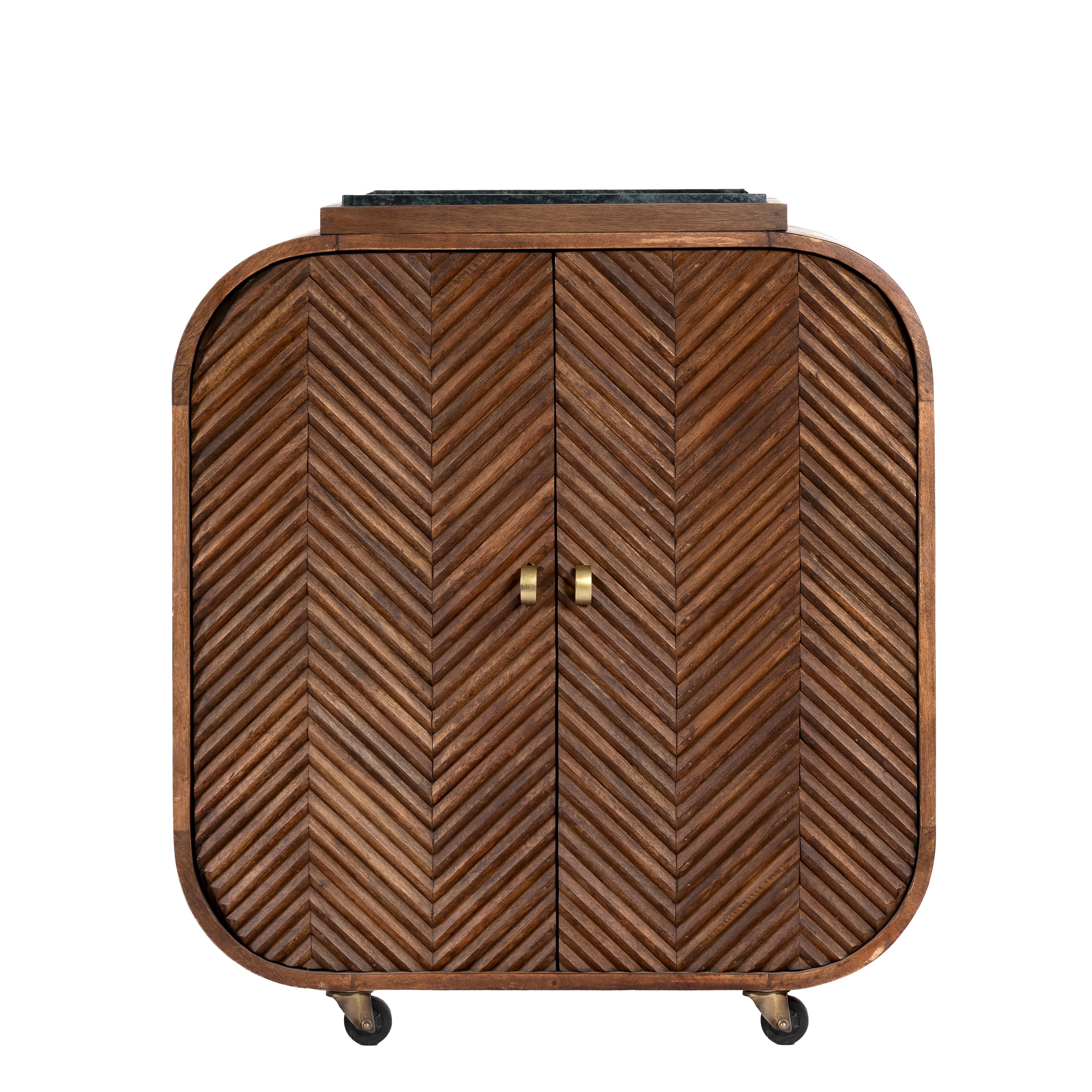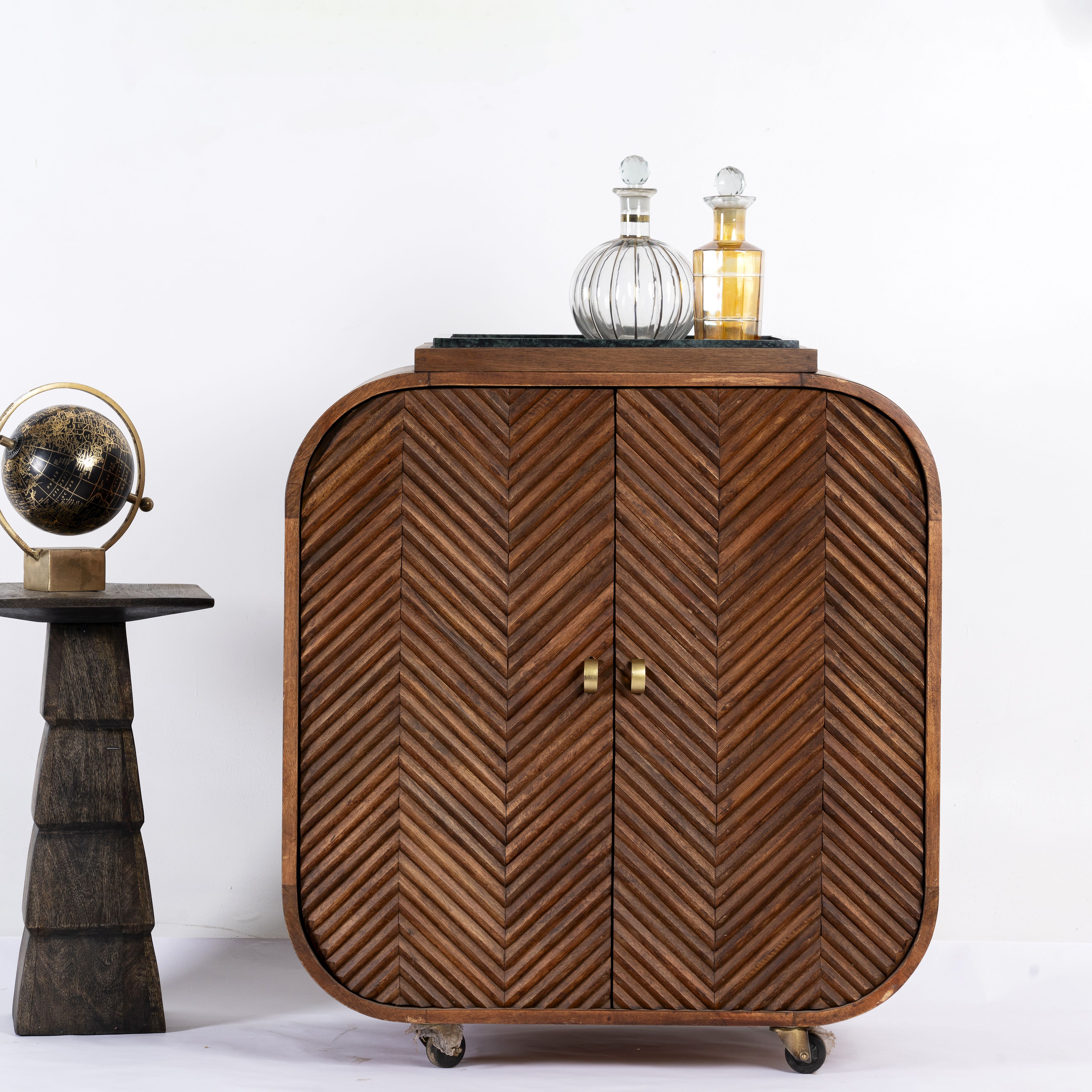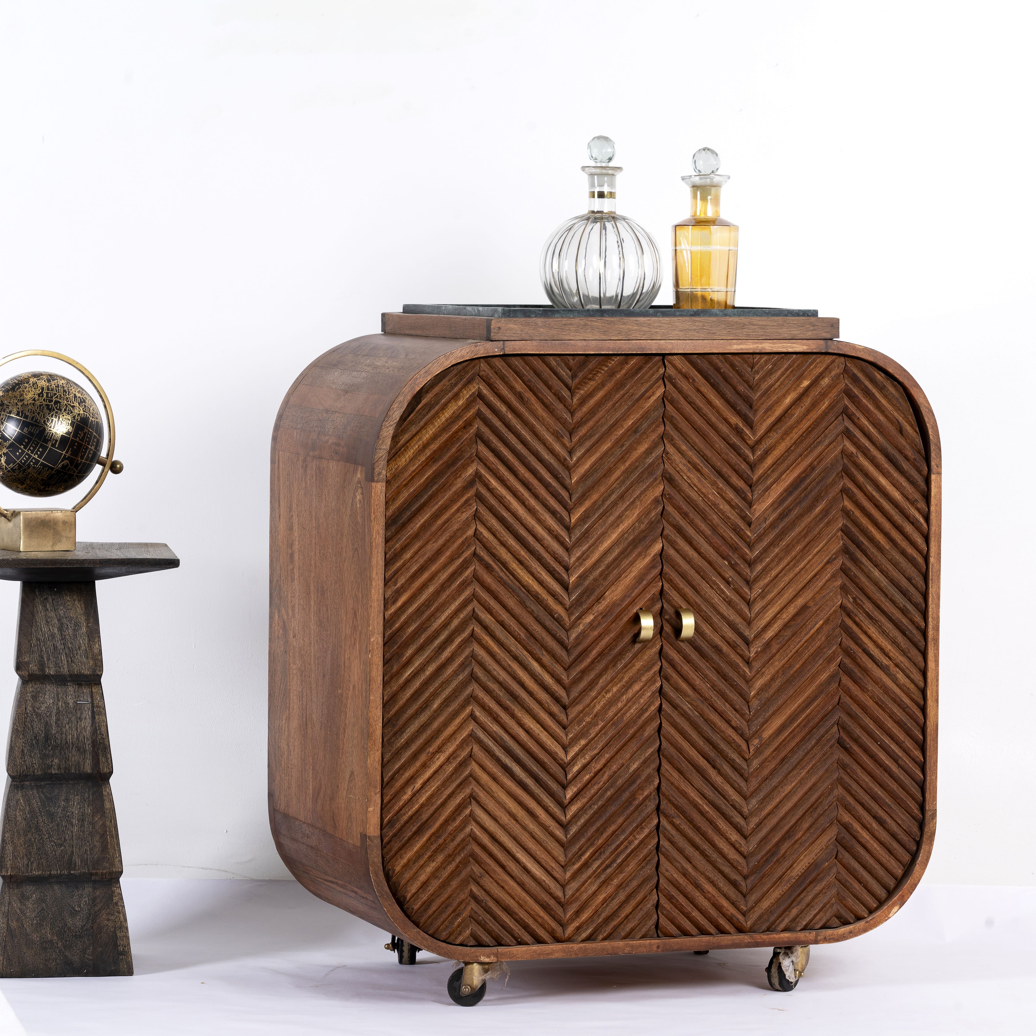 Deze stijlvolle barwagen Anaadhi is zorgvuldig vervaardigd uit mangohout, met een kenmerkende chevron-patroon houten inleg. Het combineert functionaliteit met elegantie, met een grijs marmeren dienblad en messing gecoate handgrepen en wielen die de esthetische aantrekkingskracht verhogen.