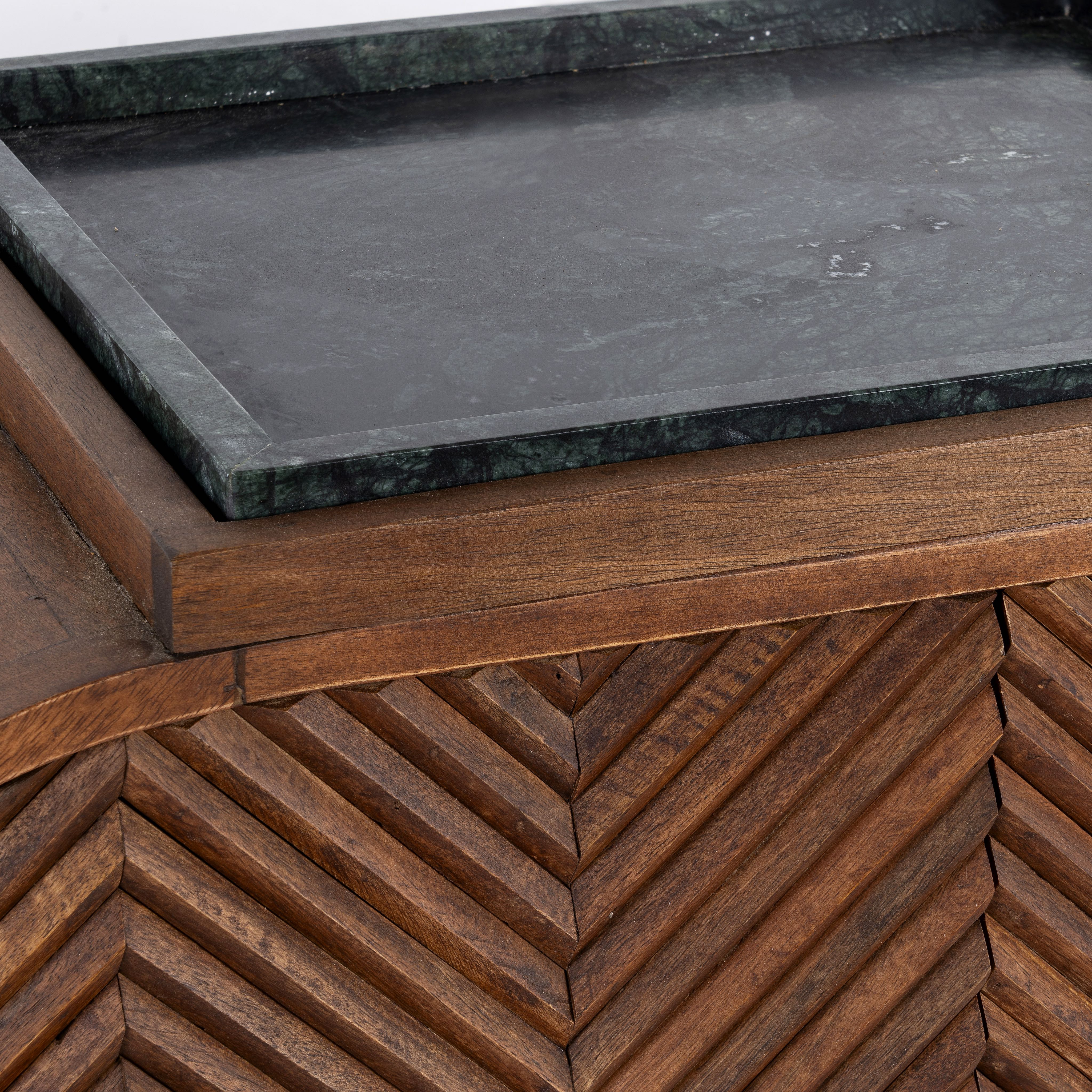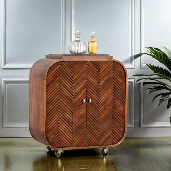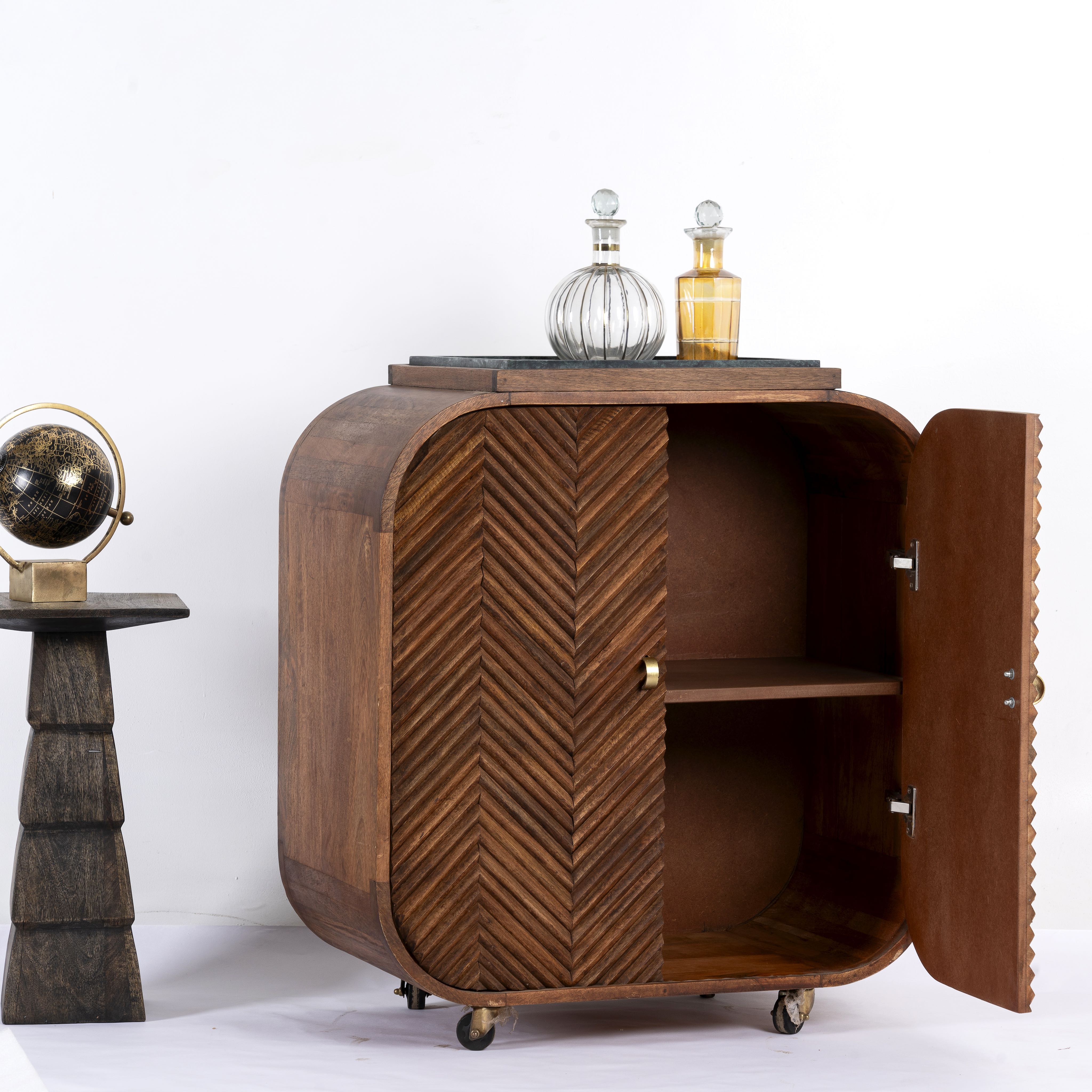 Deze stijlvolle barwagen Anaadhi is zorgvuldig vervaardigd uit mangohout, met een kenmerkende chevron-patroon houten inleg. Het combineert functionaliteit met elegantie, met een grijs marmeren dienblad en messing gecoate handgrepen en wielen die de esthetische aantrekkingskracht verhogen.