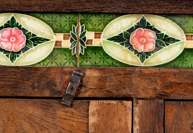 Deze antieke teakhouten vitrinekast uit Zuid-India is een prachtig voorbeeld van Portugese stijlinvloeden in design. De kast onderscheidt zich door de typische keramische inlegstukken die hem een unieke, kleurrijke uitstraling geven. Na een zorgvuldige restauratie, waarbij de kast liefdevol werd opgeknapt, werd het hout verzegeld met een laag honingwas. Dit zorgt niet alleen voor een diepe, rijke glans, maar beschermt het hout ook tegen verdere slijtage. Met zijn gekartelde randen en decoratieve houtsnijwerk biedt deze vitrinekast een opvallende aanwezigheid die charme en geschiedenis aan elke ruimte toevoegt. Het is een blikvanger die functionaliteit combineert met erfgoed en artisticiteit.